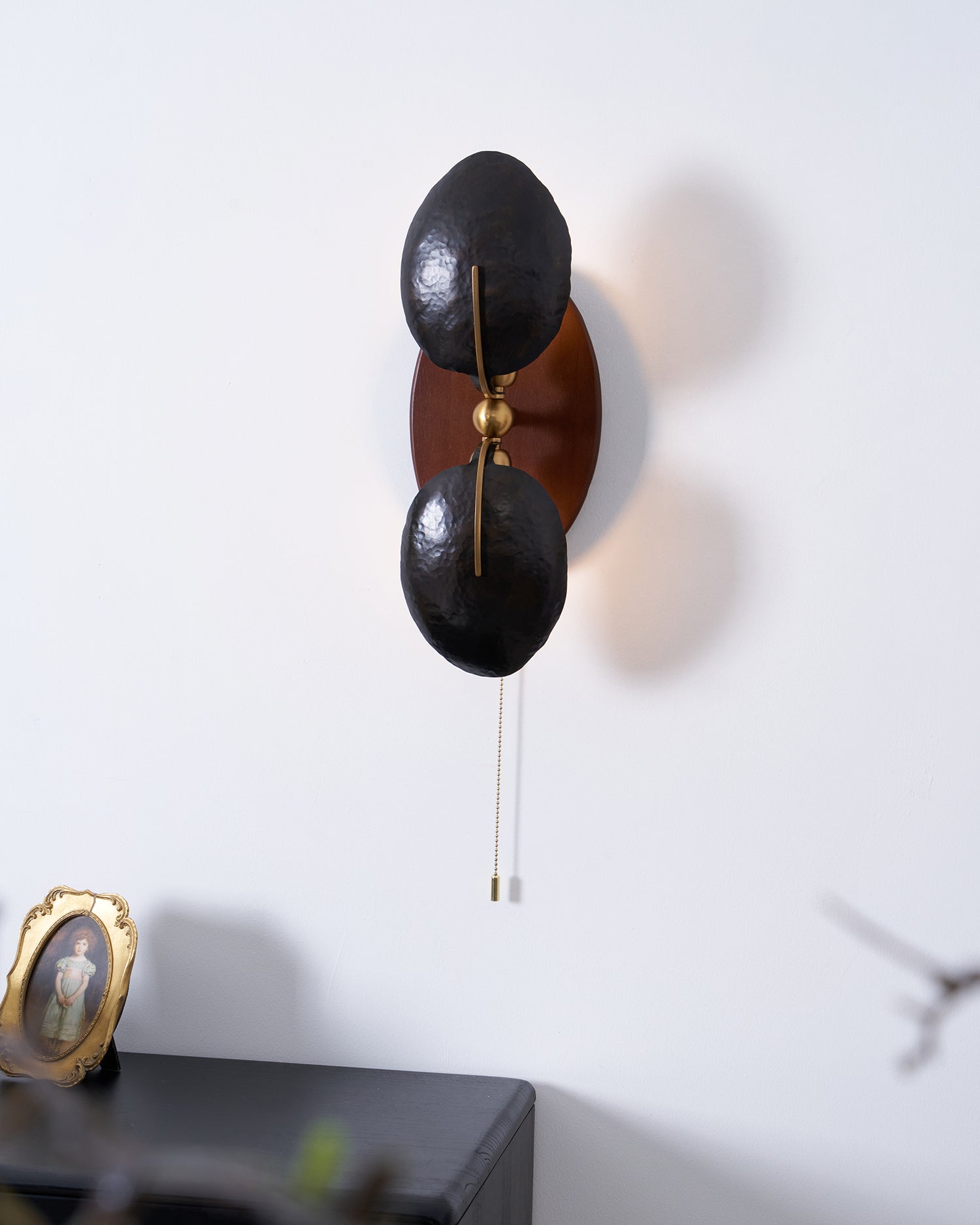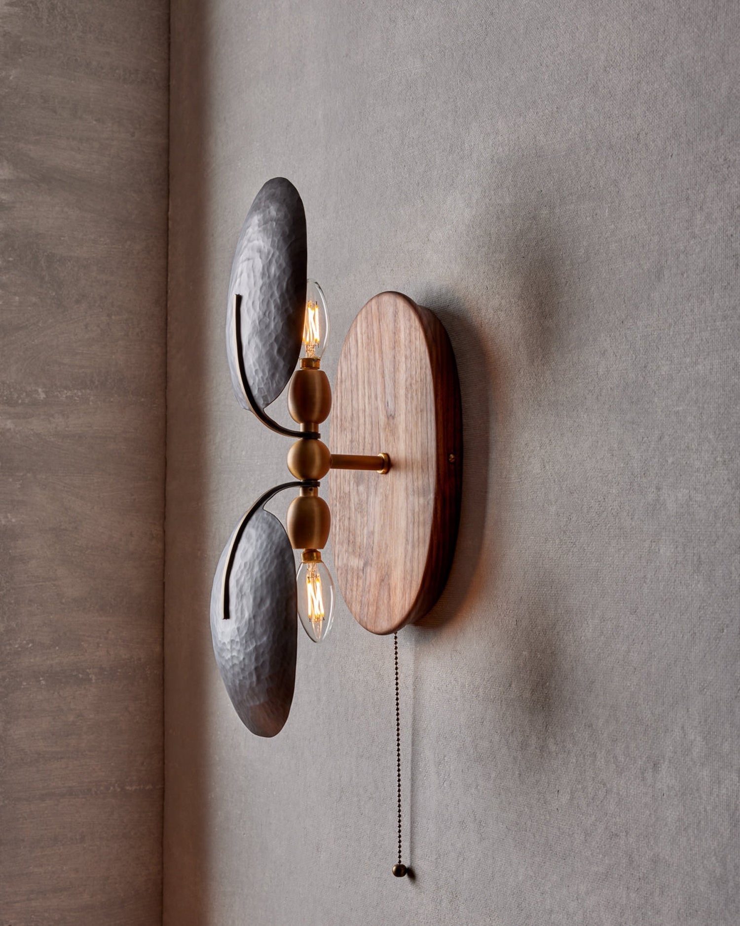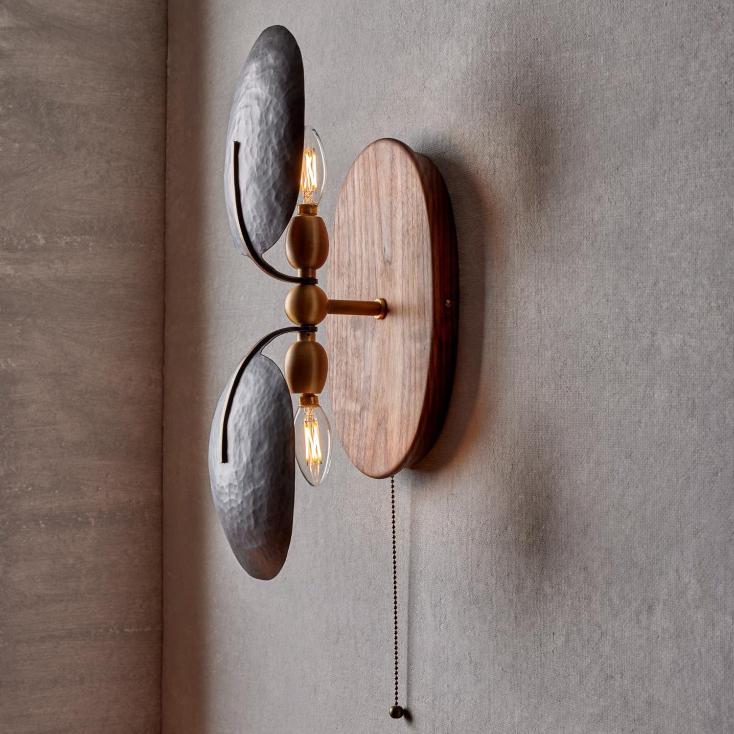 The Aero Fan Wall Light brings European sophistication to your space with hand-forged black metal construction, a solid walnut base, and refined brass accents. Expertly crafted in France, this wall lamp features intuitive zipper operation for precise light direction—perfect for reading, bedside illumination, or task-focused areas. Premium materials and meticulous craftsmanship deliver lasting durability, while warm walnut and brass tones harmonize with the matte black shade to establish an understated, elegant ambiance that elevates any interior.