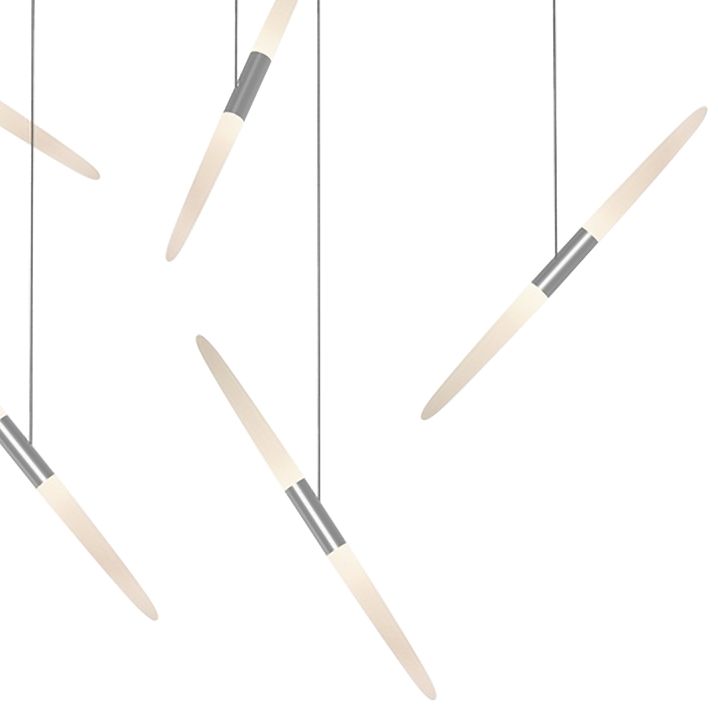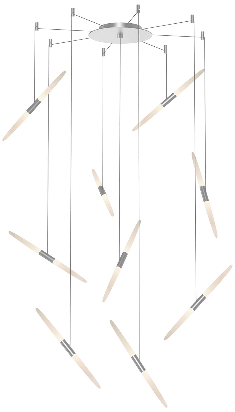 The marvelous profile of the Ballet LED pendant light by Sonneman in bright satin aluminum finish uses a collection of nine lights with frosted glass diffuser rods.