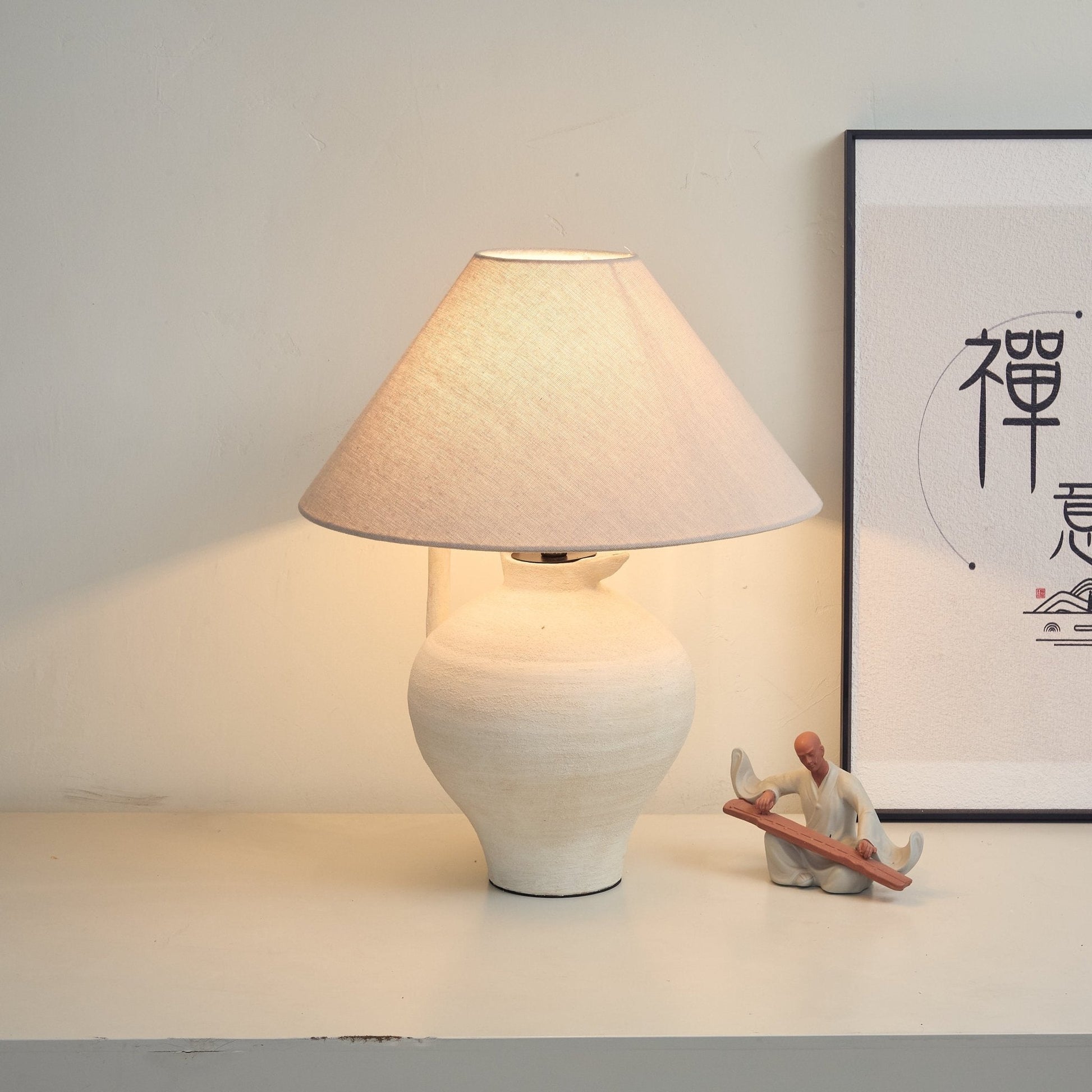 This table lamp features a base designed like a ceramic pitcher, with a textured, light - colored finish and a handle, giving it a rustic and artistic look. Topped with a neutral - hued fabric lampshade, it diffuses light softly. Perfect for adding a touch of vintage charm and warm ambiance to bedside tables, desks, or cozy corners in living spaces.