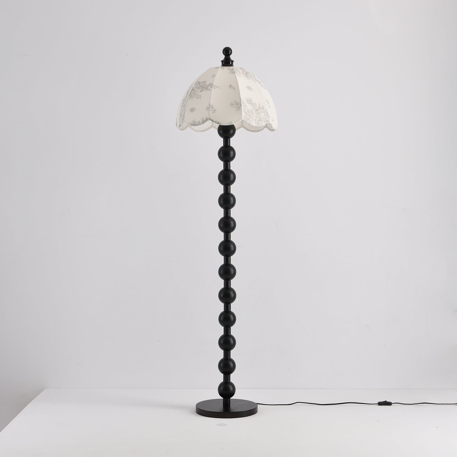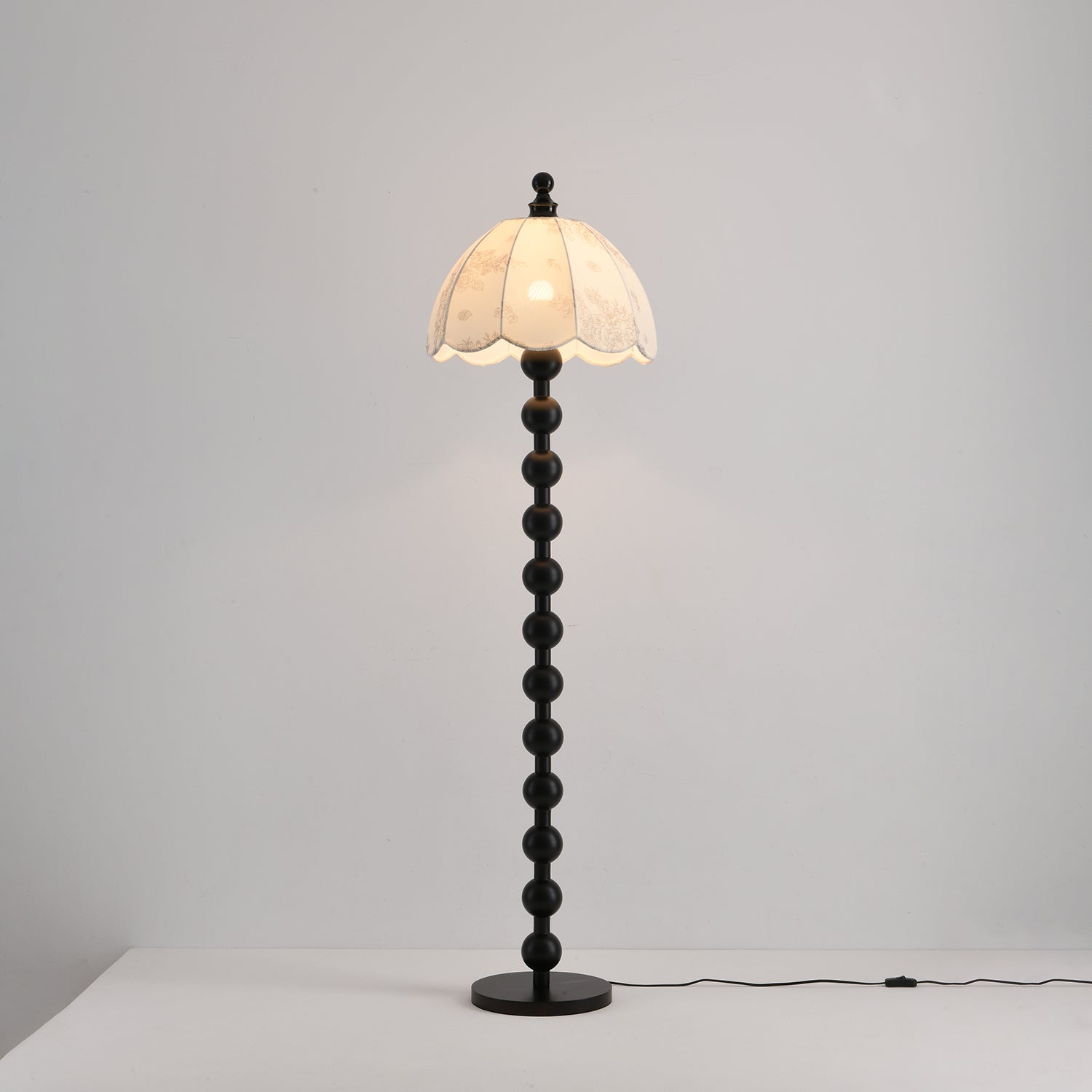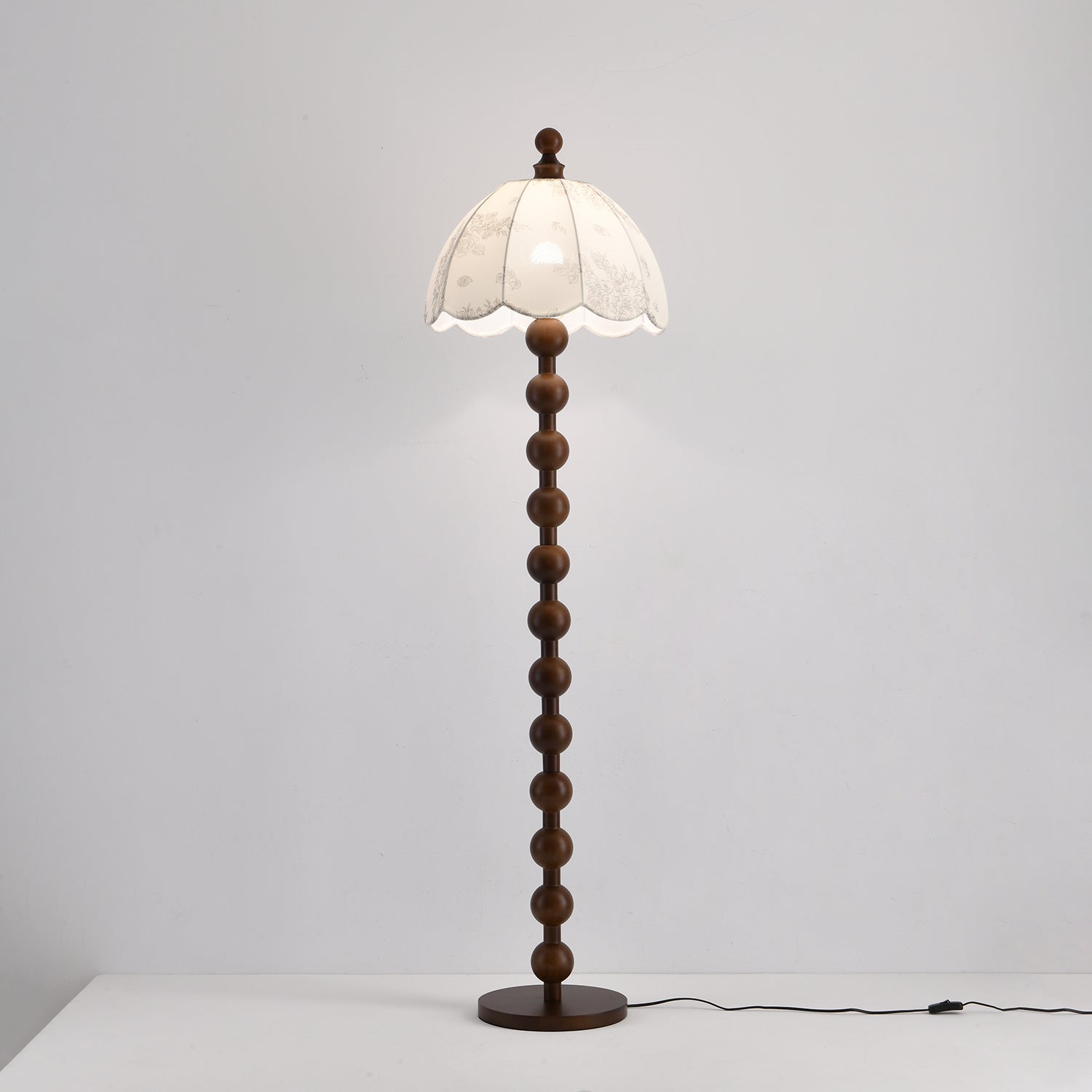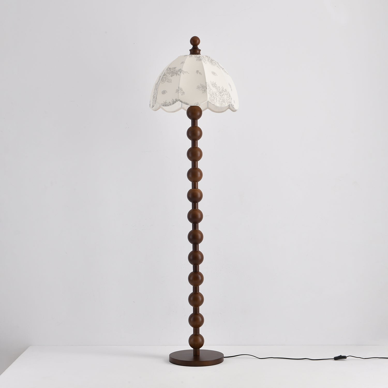 The Dottie Belle Floor Lamp brings vintage charm and timeless elegance to any interior. Its standout feature is the sculptural wooden stem, crafted from a stacked series of perfectly rounded spheres in a rich walnut finish. The lamp is topped with a scalloped fabric shade in a soft cream tone, delicately printed with botanical and seashell motifs for a nostalgic touch. The dome-shaped shade casts a warm, ambient glow, ideal for creating a cozy reading nook or adding a whimsical accent to a living room or bedroom. Both decorative and functional, this lamp blends classic cottage style with artisanal detailing.