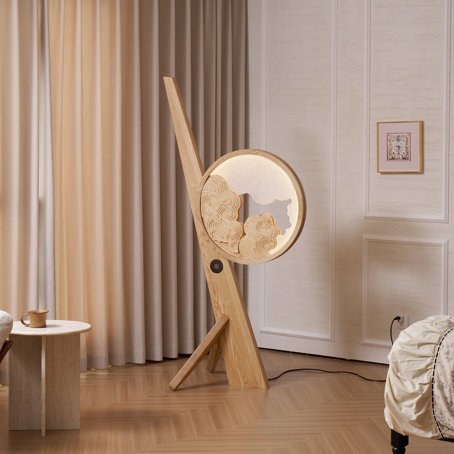 Inspired by traditional Chinese landscape painting, the Shan Shui Floor Lamp is a poetic fusion of art and illumination. Crafted with precision-cut wood in layered topographic forms, it mirrors serene mountain ranges emerging through mist. The circular lamp head evokes a moonlit sky, beautifully complemented by diffused lighting that brings calm and warmth to any space. With its sculptural silhouette and cultural symbolism, this lamp is perfect for design lovers who appreciate artistic expression with ambient function.