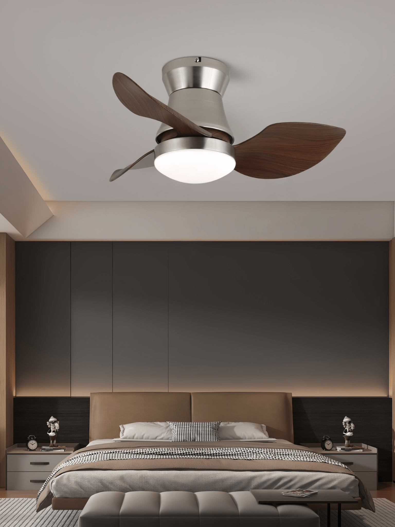 The Solano Bloom Ceiling Fan showcases a compact design with gracefully curved walnut-finish blades and a sleek brushed metal base. Its petal-inspired form creates a dynamic visual even when still, while the integrated LED light adds warm, diffused illumination. Ideal for small rooms, cozy nooks, or modern apartments that crave both charm and function.