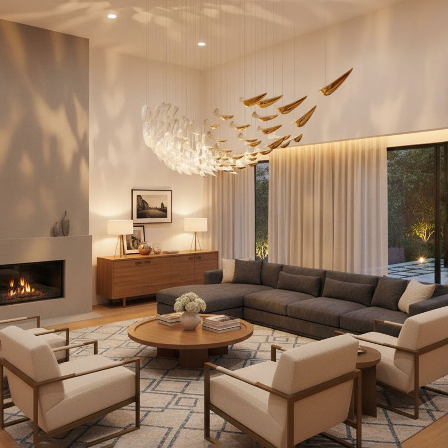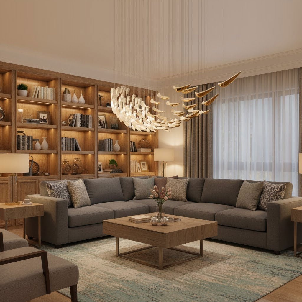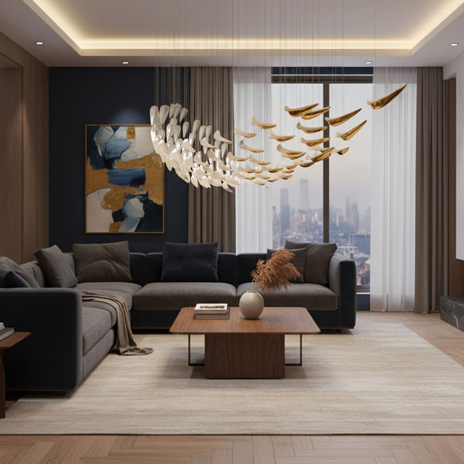 The White Feather Art Deco Chandelier by sunweartfurniture brings elegance in motion with its cascading arrangement of wing-like glass elements in soft white and glistening gold. Suspended in a graceful inverted cone form, each piece mimics the delicate curve of a feather, creating a dynamic yet serene visual impact. Perfect for interiors seeking a touch of sophisticated artistry.