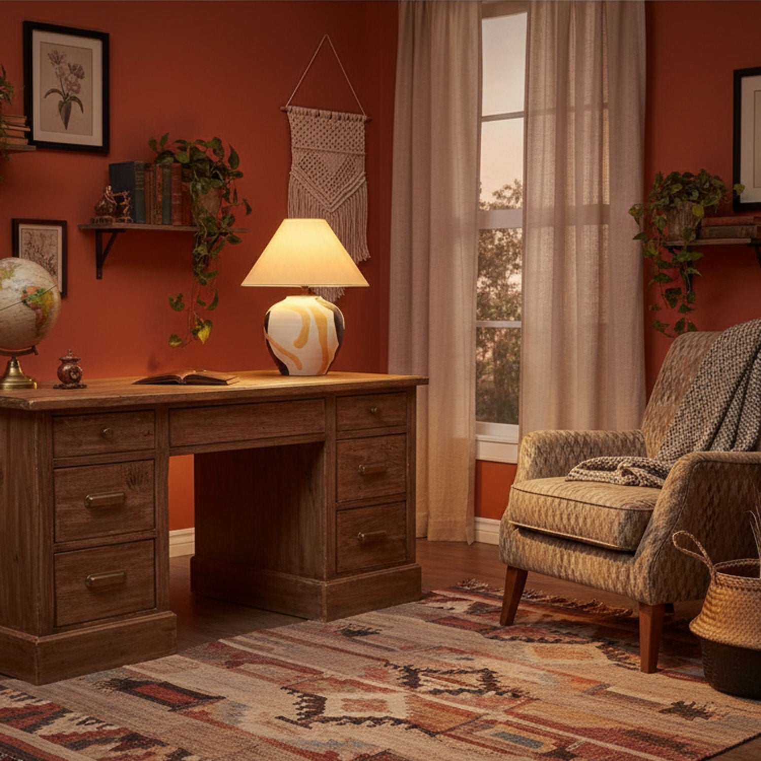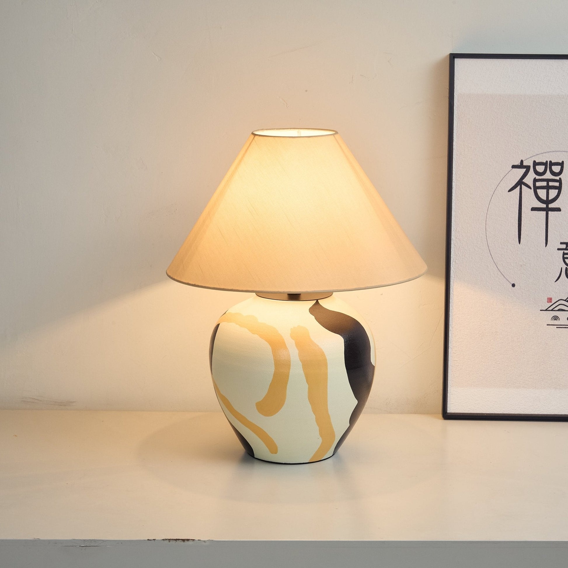 This table lamp features a base with an abstract pattern in earthy tones, crafted from ceramic, giving it an artistic and unique look. Topped with a conical, neutral - hued fabric lampshade, it diffuses light softly. Perfect for adding a touch of creative and warm ambiance to bedside tables, desks, or living spaces.