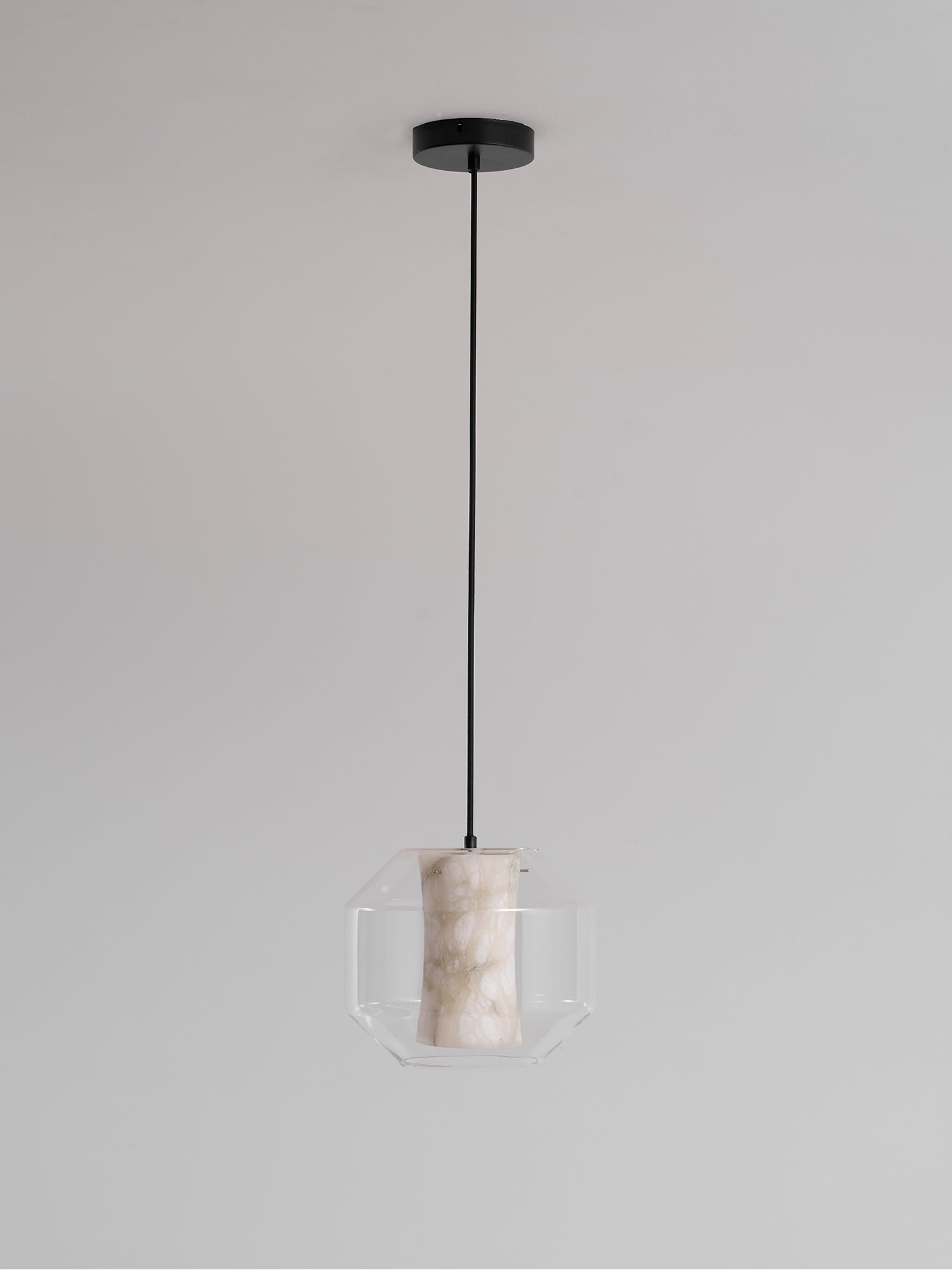 The Alabaster Glass Cylinder Pendant Light blends sculptural elegance with natural sophistication. At its core, a hand-carved alabaster column radiates a warm, ambient glow, enhanced by the translucent veining unique to each piece of stone. Encased in a sleek, faceted glass outer shell, the design creates a striking interplay of texture, light, and form. Suspended by a minimalist black cord, this pendant is ideal for modern interiors—whether used solo as a refined accent or in multiples above kitchen islands, vanities, or dining spaces. A timeless lighting solution that elevates any room with quiet luxury.