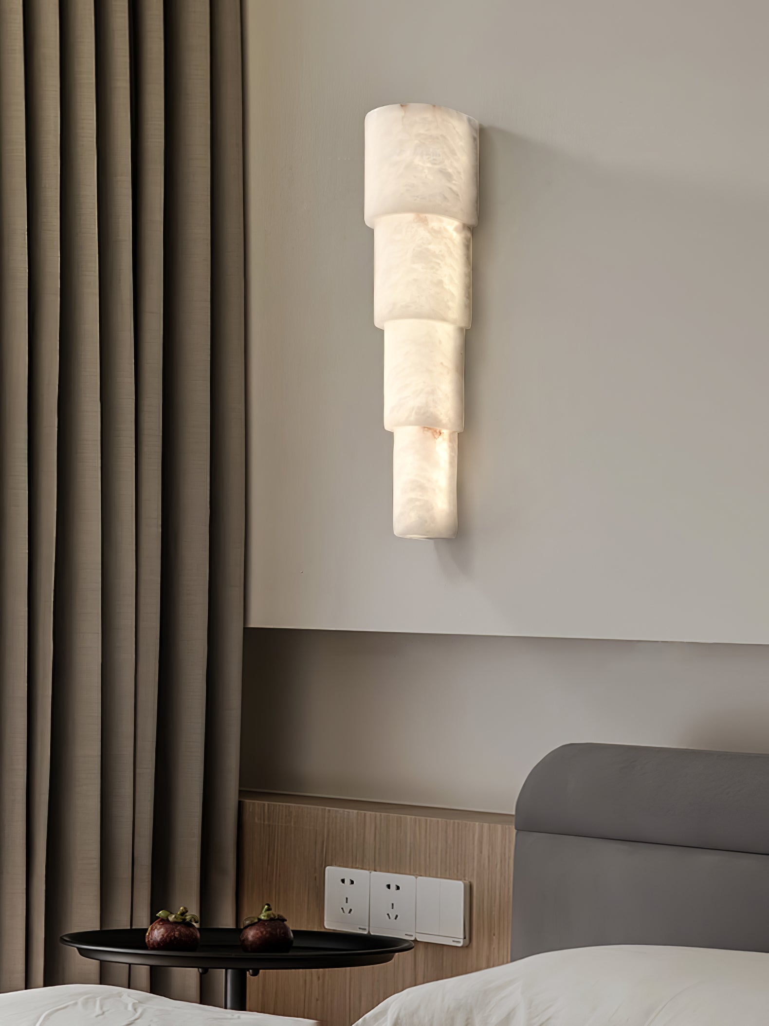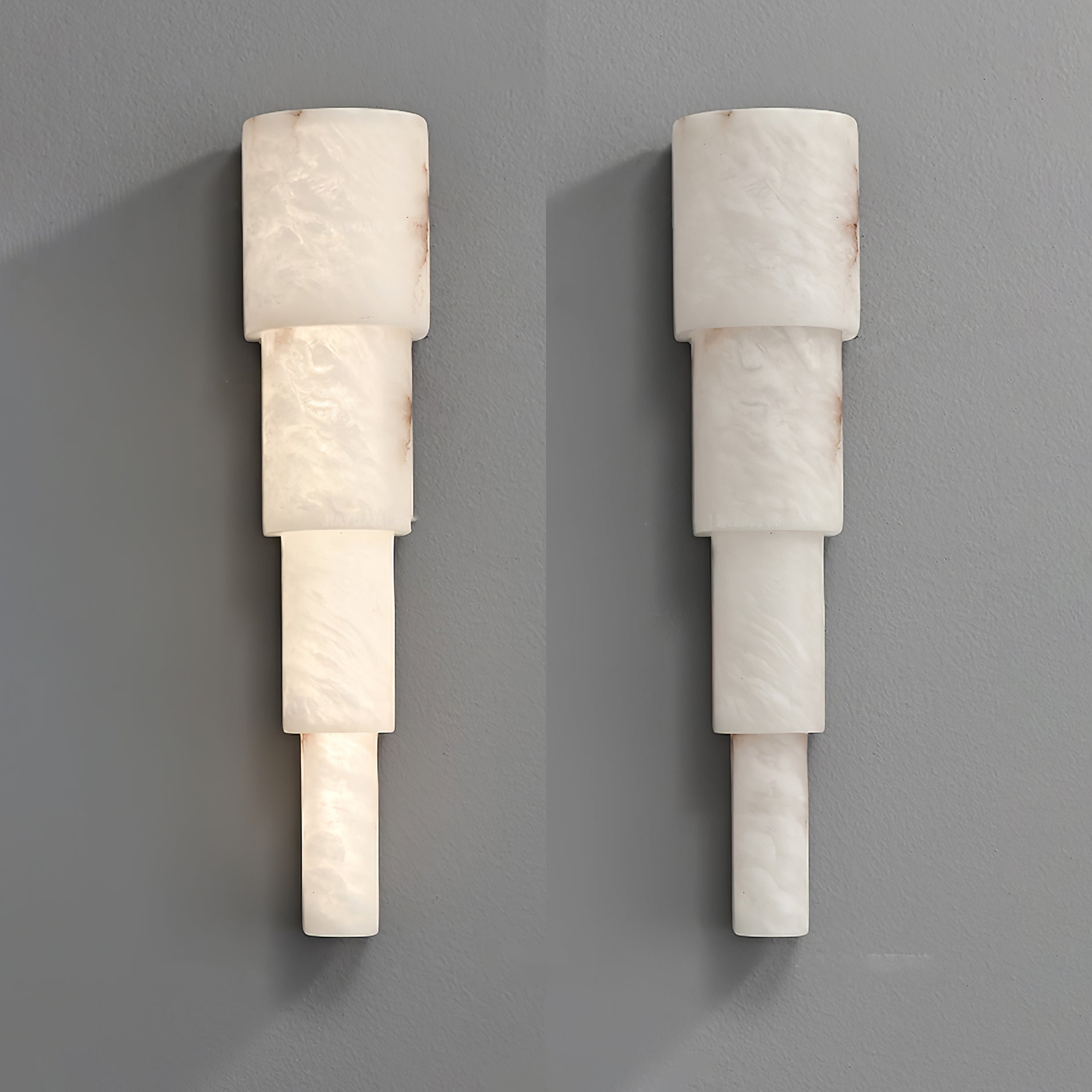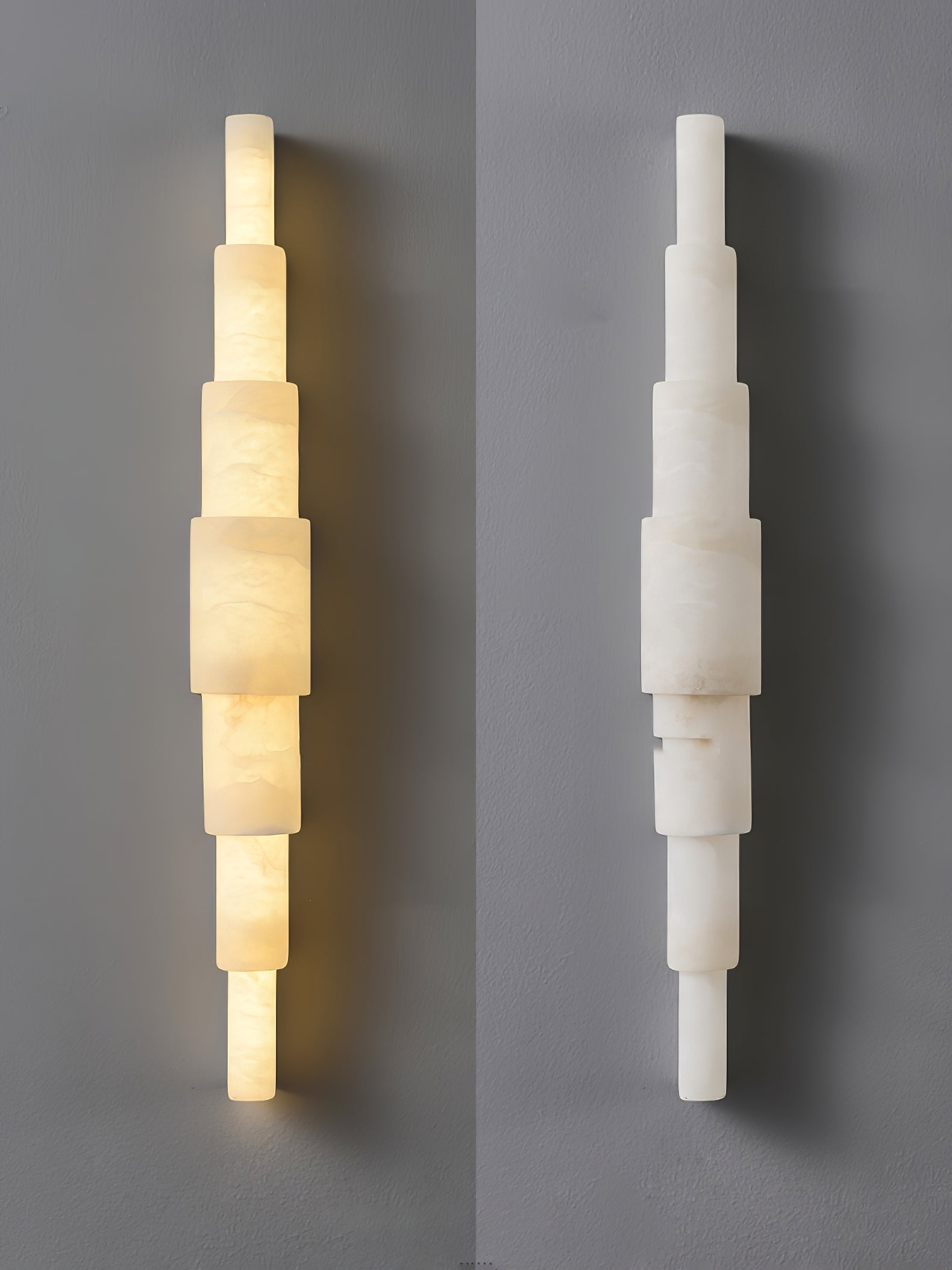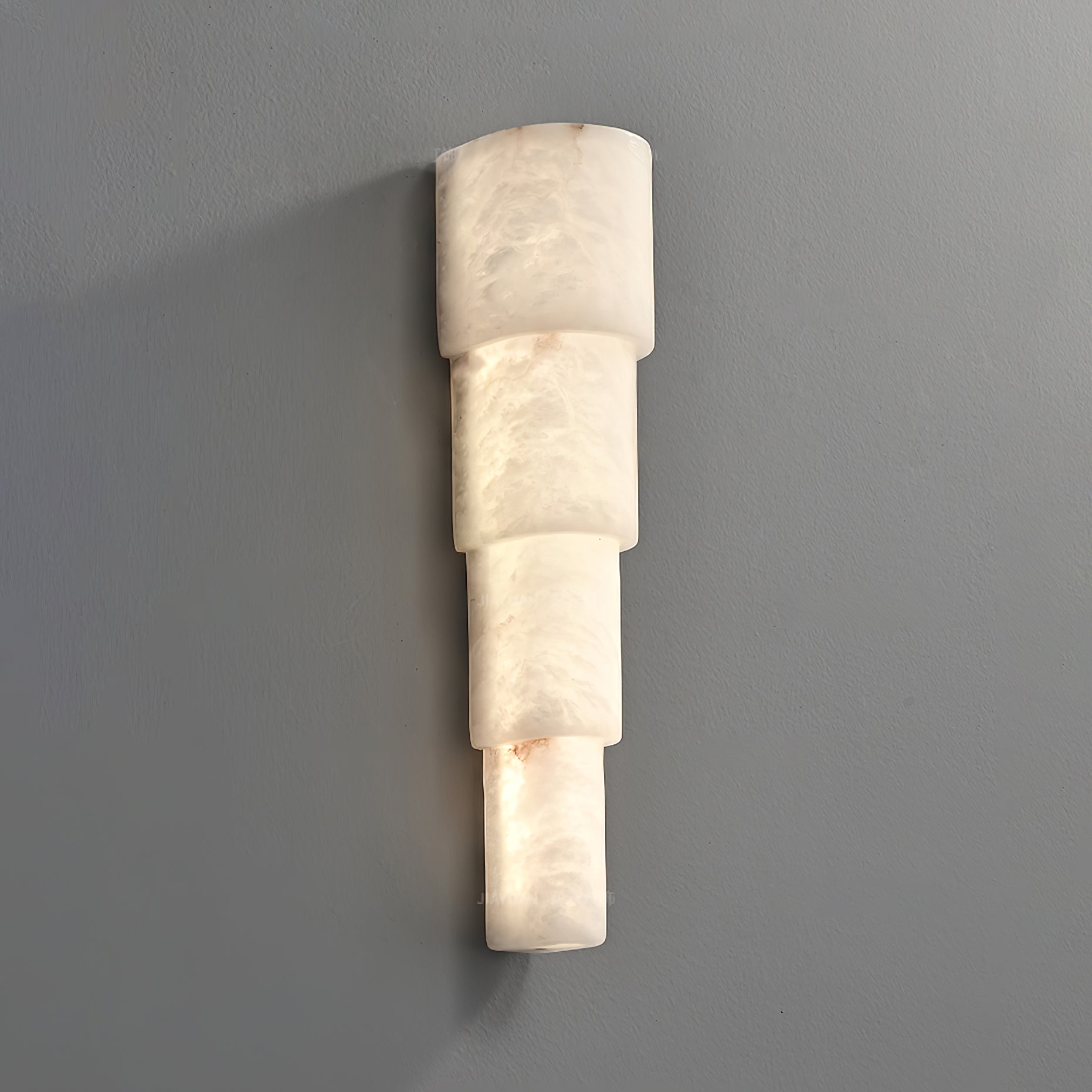 Introducing the Alba Cascade Alabaster Wall Sconce, a sculptural masterpiece designed to elevate your space with its sleek, vertical flow. Crafted from premium alabaster, this light features a cascading effect that beautifully softens the glow, creating an atmosphere of refined warmth and serenity. Each layer is delicately stacked, allowing the alabaster's natural veining and translucency to shine through as the light gently diffuses around the room.