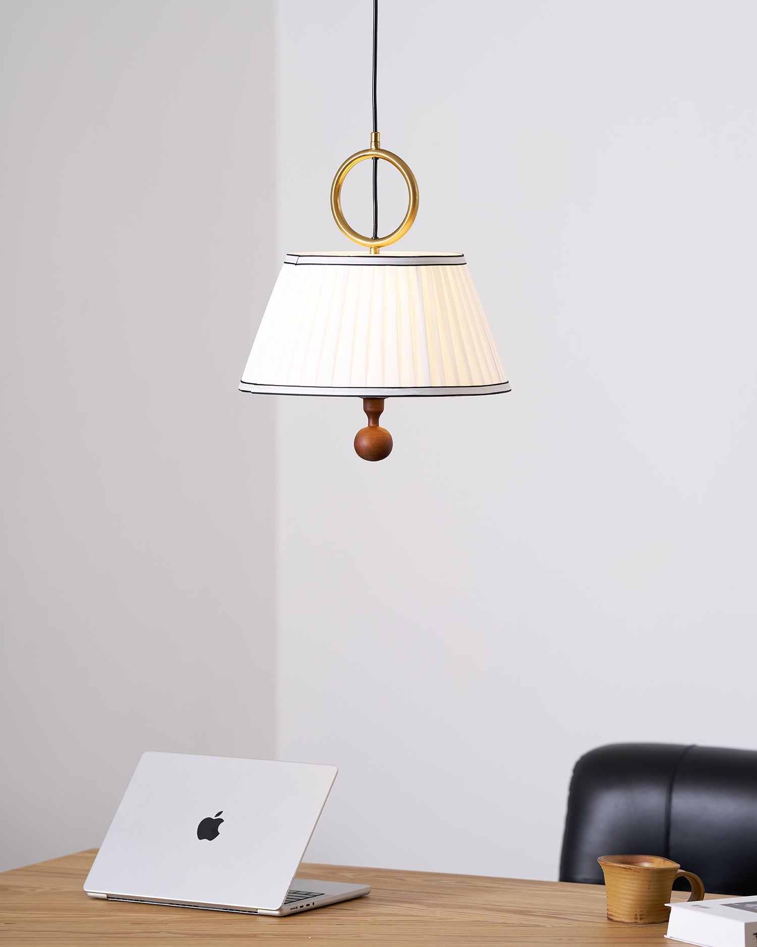 The sunweartfurniture Alina Pendant Lamp showcases a sophisticated and refined design that adds a timeless touch to any room. The pleated fabric shade, elegantly accented with a golden metal ring and a wood-textured ball at the base, creates a perfect harmony of modern and classic elements. The soft, diffused light creates a warm, inviting atmosphere, making it ideal for dining rooms, living areas, or contemporary kitchens.