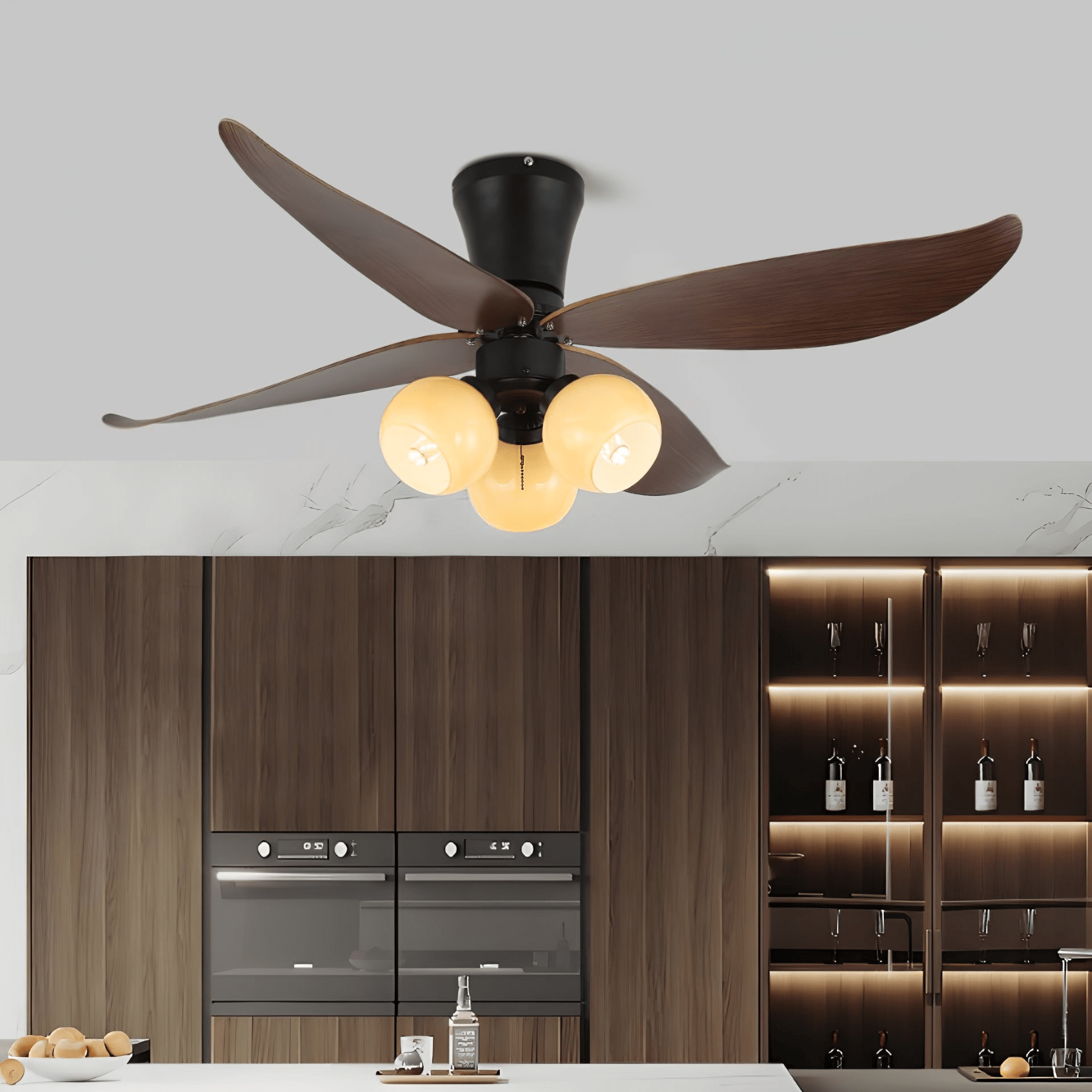 The Arbora Bloom Ceiling Fan Light channels organic beauty through petal-shaped wooden blades and soft glass globes that echo blooming flowers. Its dark wood grain and matte black base add a grounded sophistication, while the multi-light design ensures bright, even illumination—ideal for cozy bedrooms, tranquil dining rooms, or nature-themed interiors.