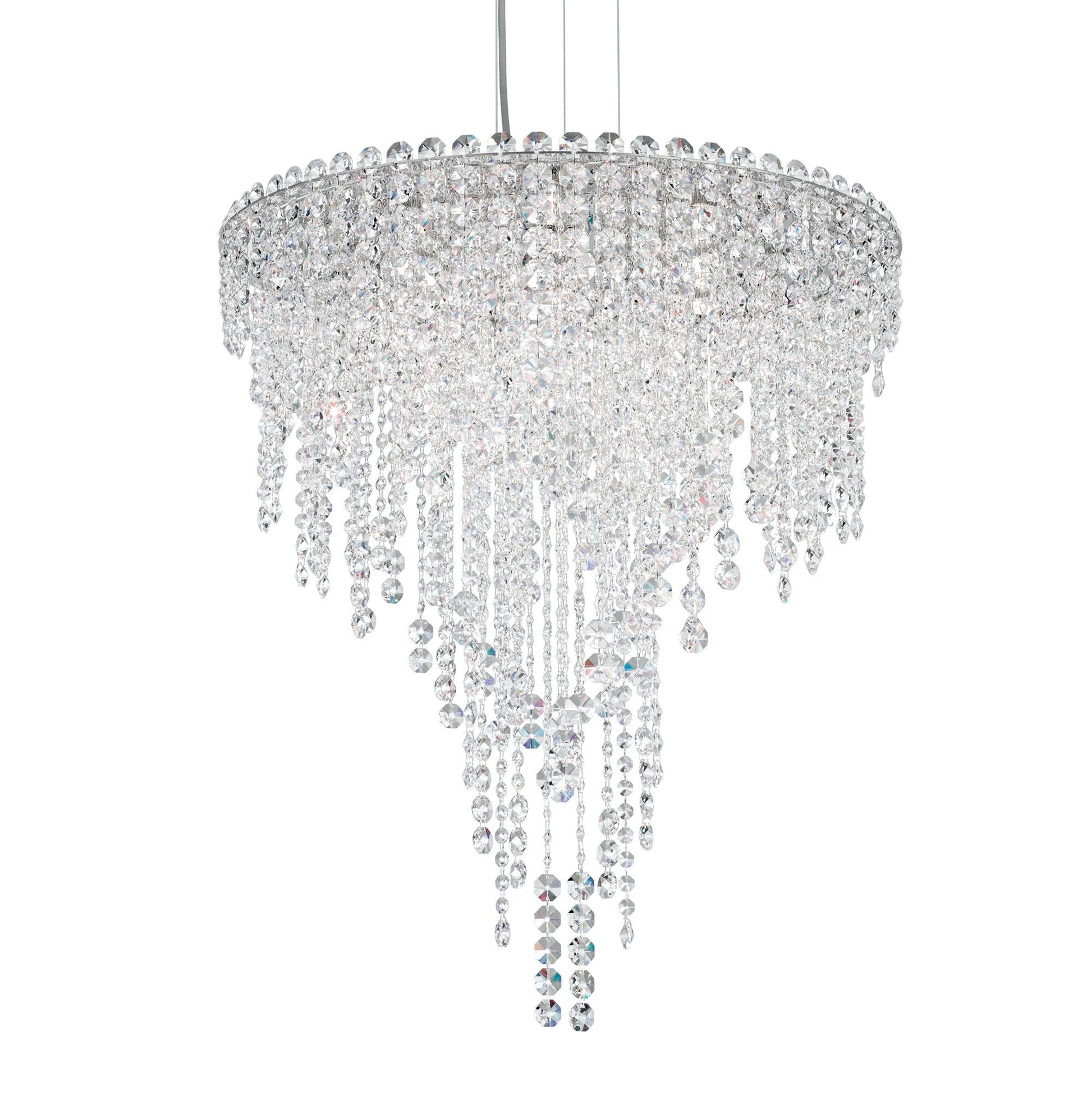 Exuding celestial brilliance, this modern glam chandelier dazzles with cascading crystal shimmer and clean, contemporary edges.