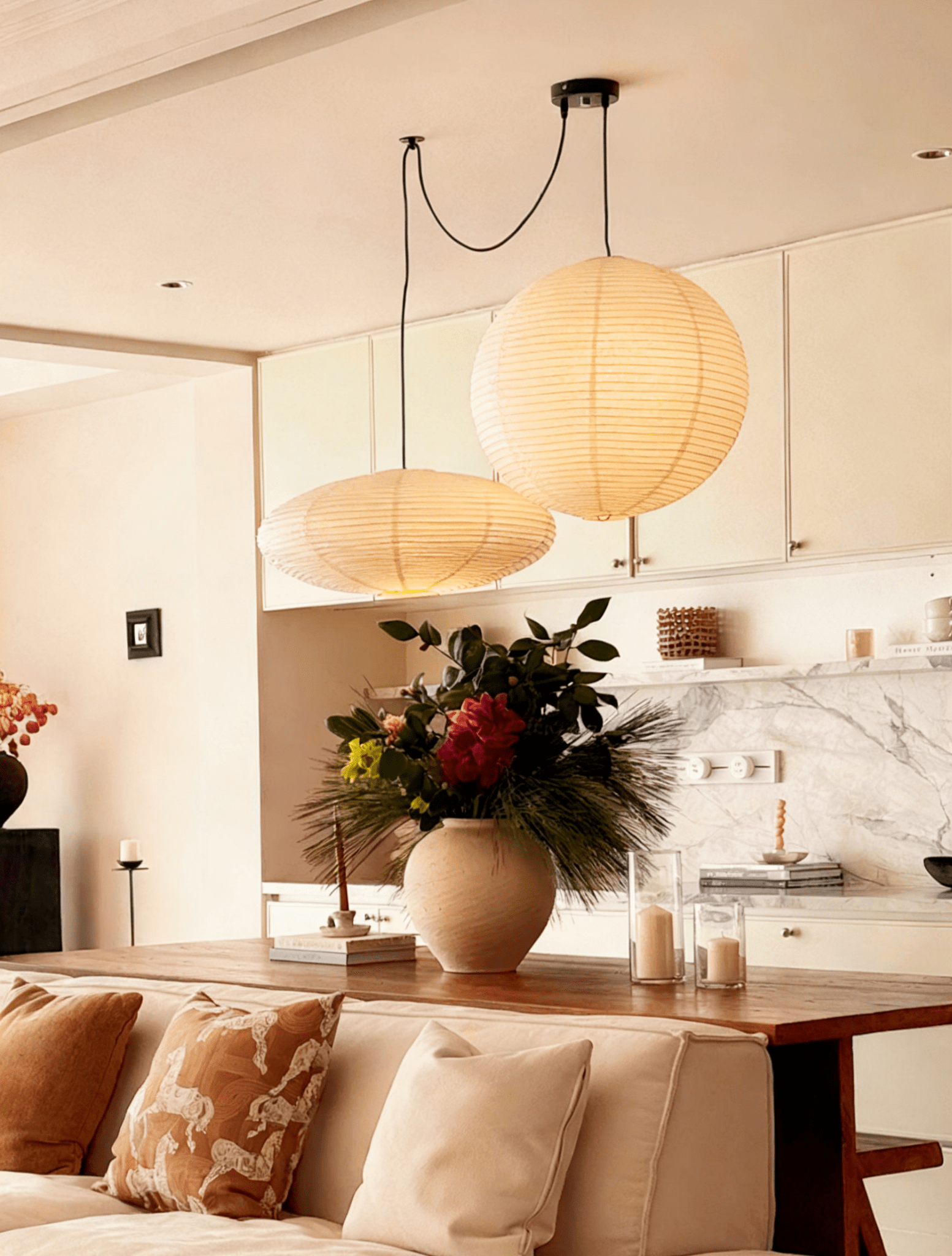 This pendant light set showcases two white, textured shades—one spherical, one oval—suspended by gracefully curving black wires. Emitting a gentle, diffused glow, it blends minimalist design with a whimsical, cloud - like charm, ideal for infusing spaces with a serene and artistic ambiance.