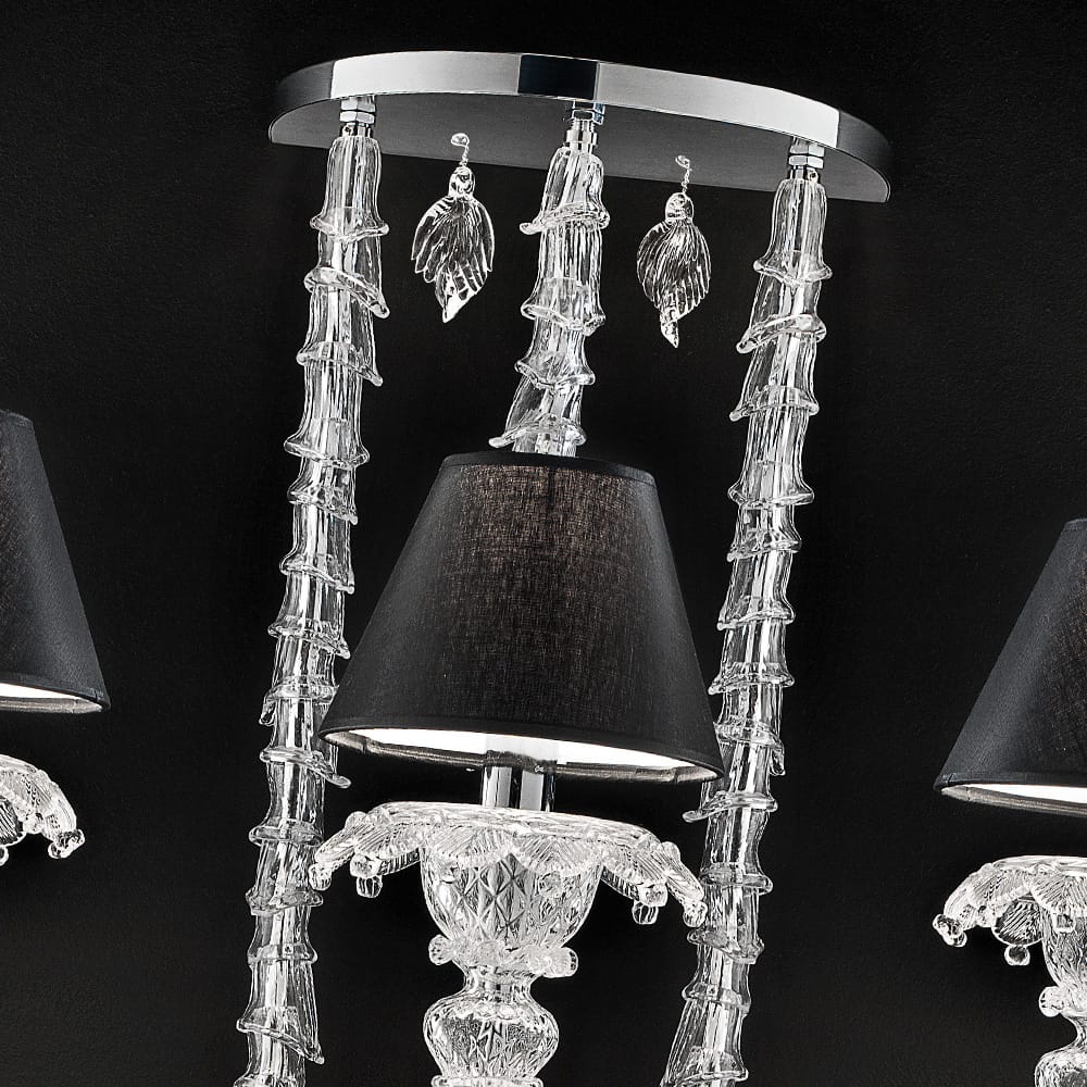 This enchanting three light wall lamp is no exception and offers an exquisite addition. 3 curved chrome branches fall from a modern chrome semi-circle wall plate, each perfectly encased and fashioned in clear Murano glass. Each light is held in an elegantly engraved bobeche and is complete with a luxury black shade. Altogether providing a mesmerising design with footholds in both modern and classic style.