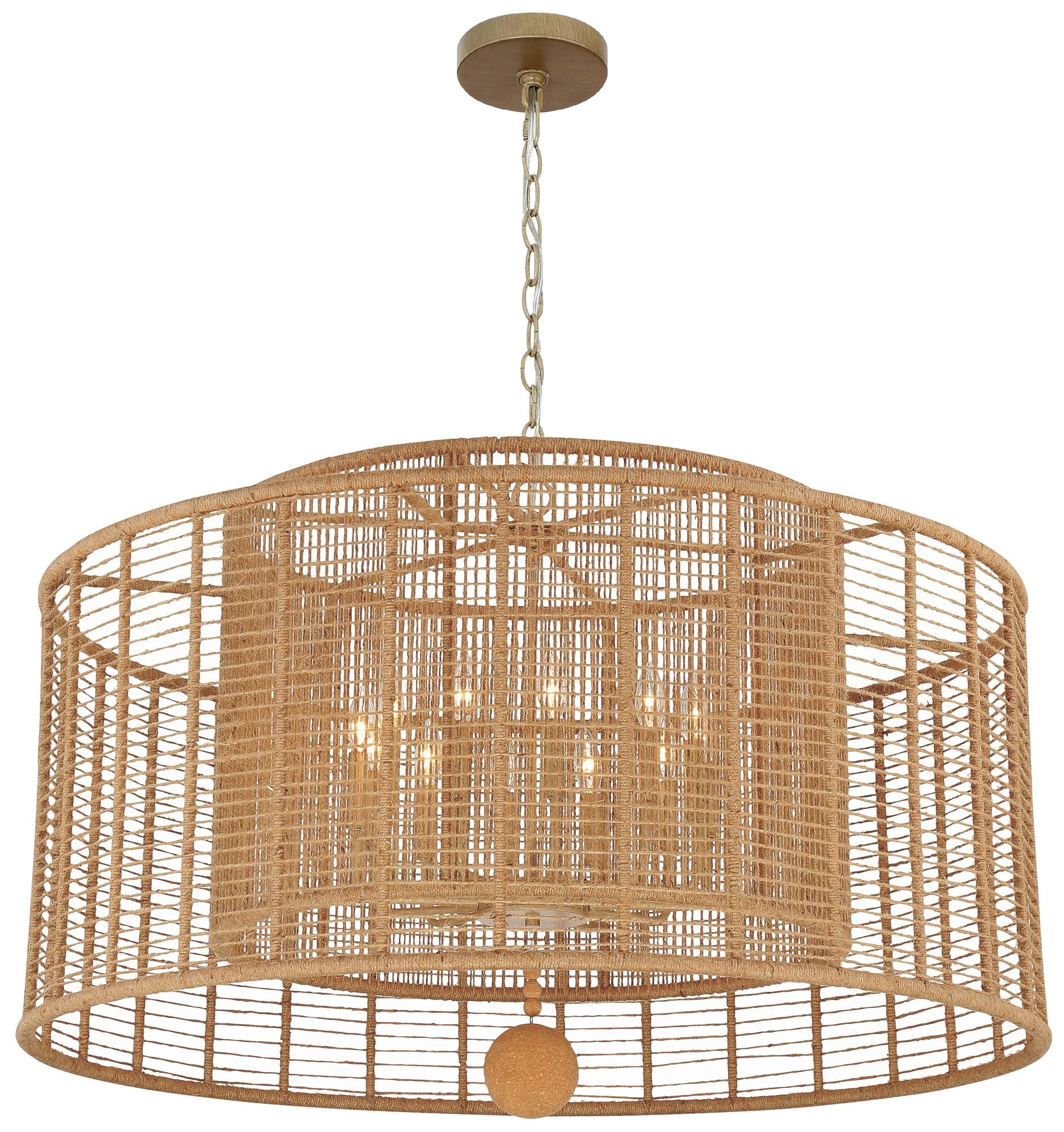 A dual shade design flatters this farmhouse-coastal style twelve-light chandelier with a burnished silver finish and hand-wrapped natural jute frame.