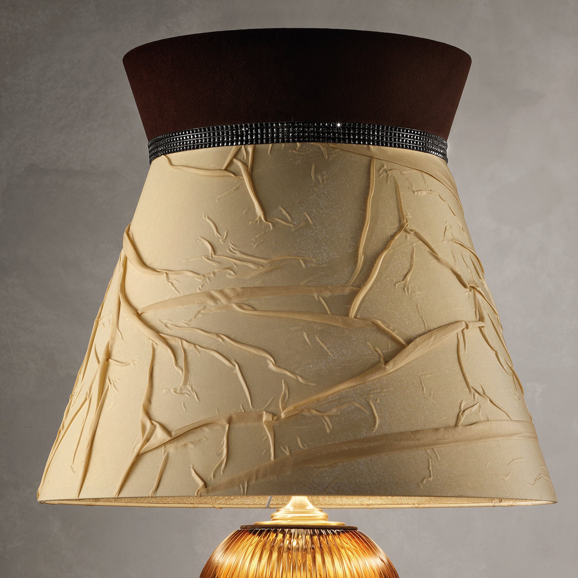 A beautifully detailed ornate brass structure in a polished gold finish, with feature genuine brown leather covering. Adorned with shimmering black rhinestone detail, and supporting an elegantly shaped body of amber cut glass produced in Tuscany. Completed by a statement modern shade in a hand creased design, with a rich brown alcantara fabric collar and tying in with black rhinestone detailing. Requires 1 x max 60W E27 Bulb, which is not included. Weight 10 kg. Available with different shades, with black leather covering and in a polished silver finish and clear glass by request. Prices will vary.