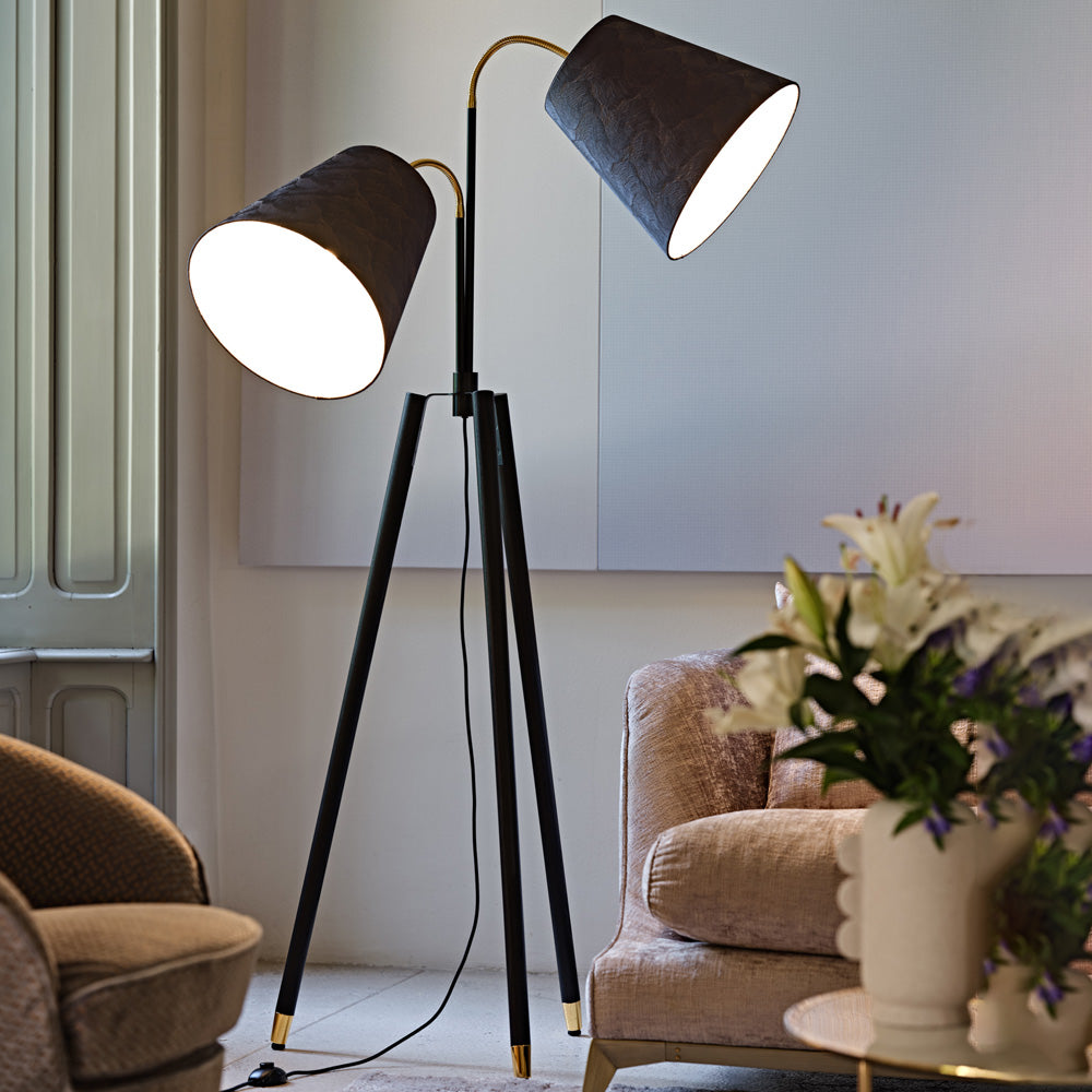 Balanced by design, a solid ash wood tripod structure with matt black painted metal details gives a sense of lightness. Cradled by defining metal detailing in polished gold finishes. Two adjustable lampshades offering diffused light, are decorated with rich textured fabric of Japanese inspiration and complete it, making it the star of the show. Requires 2 x E27 bulbs, LED bulbs suggested not included. Plug type F (EU- schuko) with adapter type A (USA) or type G (UK). CE certified.