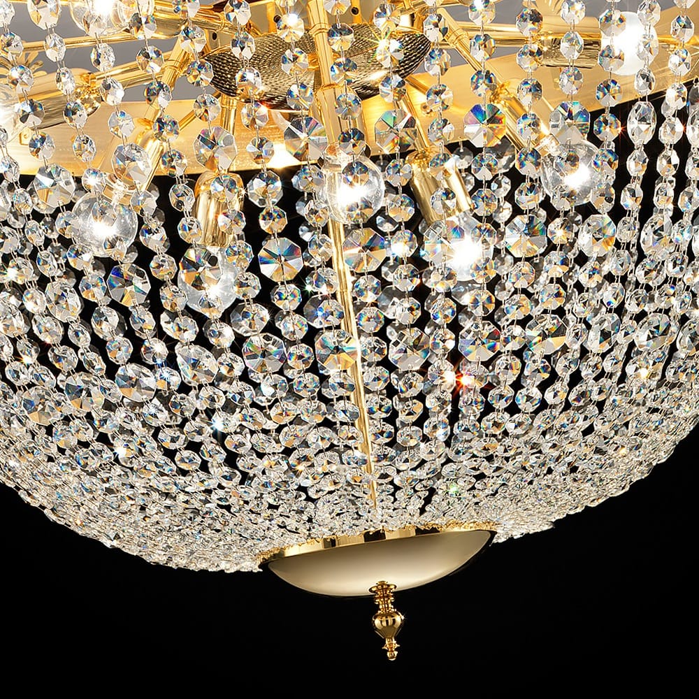 The Luxury Gold Crystal Ceiling Light, this opulent gold plated ceiling light boasts a series of Premium or Cut Crystal pendants. Its beautifully crafted circular structure includes intricate detailing and is covered in a series of designer beads.