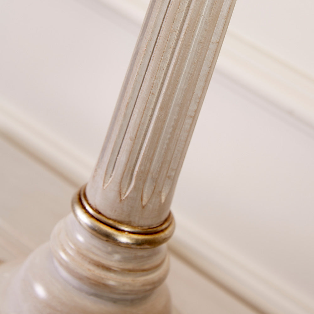 Shown here in a stunning antiqued ash grey finish, featuring beautiful hand painted champagne detailing and completed with an ivory pleated shade. Height 68 cm x diameter 50 cm. Requires an E27 Bulb Max 60W, not included. Also available in a range of alternative finishes and colours. Prices may vary.