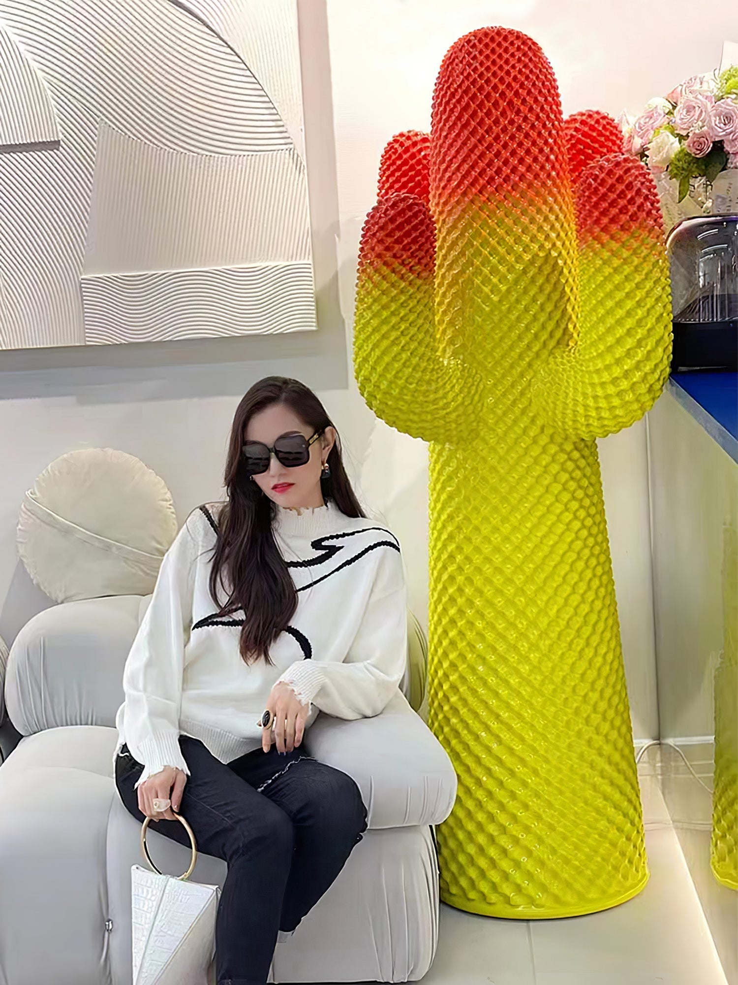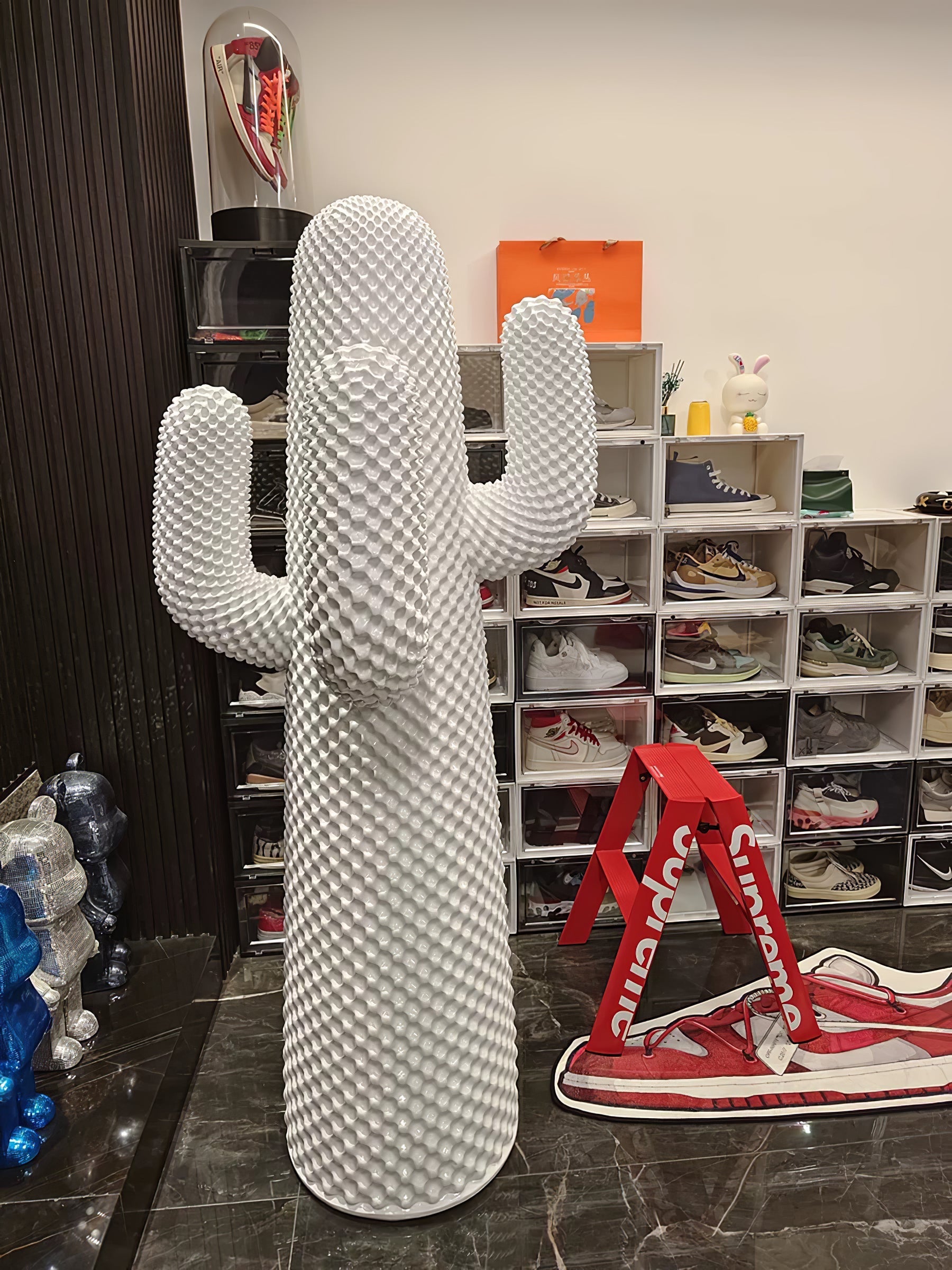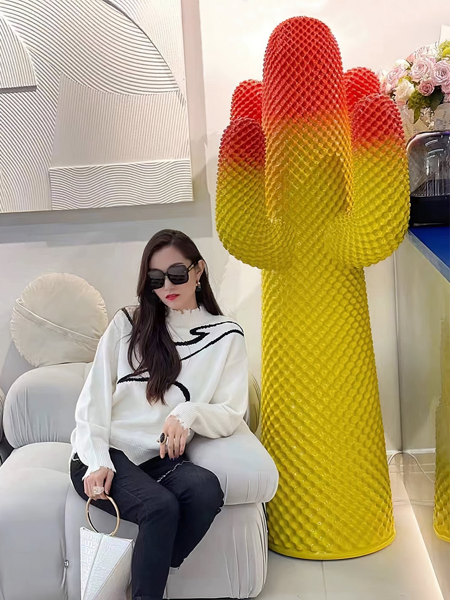 Introducing the Mello Sculptural Cactus Coat Rack, a functional piece of decor that seamlessly combines form and function. Its playful cactus-shaped design serves as a coat rack and adds a touch of whimsy to any space. With its pop art icon status, it's sure to be an eye-catching addition to your home.