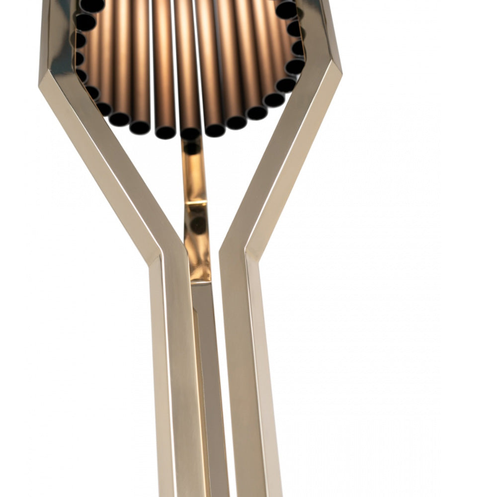 Formed of concentric brass tubes, supported by a statement angular geometric structure. Shown here in a gold and black nickel finish. Giving it a cohesive and deluxe look. Requires 6 x G9 40W bulbs, bulbs are not included weight approximately 16 kg. Also available in various other finishes such as matt gold, polished, matt and brushed black and matt black nickel, polished, brushed and oxidised brass, and polished or brushed copper. Offering the ultimate in versatility.
