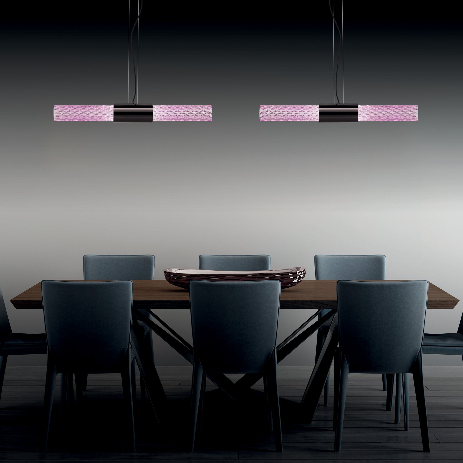 Balanced by design. A handcrafted metal structure in a black nickel finish, supporting a dazzling rose pink faceted crystal diffuser made in Tuscany. With LED lighting highlighting the perfection of the crystal. 2 spot LED 9W 4000~K 220 Vdc 700 lm life time 30.000 hrs SMD type 5630. Weight 3.5 kg. Compatible with dimmable systems. Dimensions are plus metal hanging cables. Also available with a satin gold finish and in transparent, green or aquamarine crystal colours by request. Prices will vary.