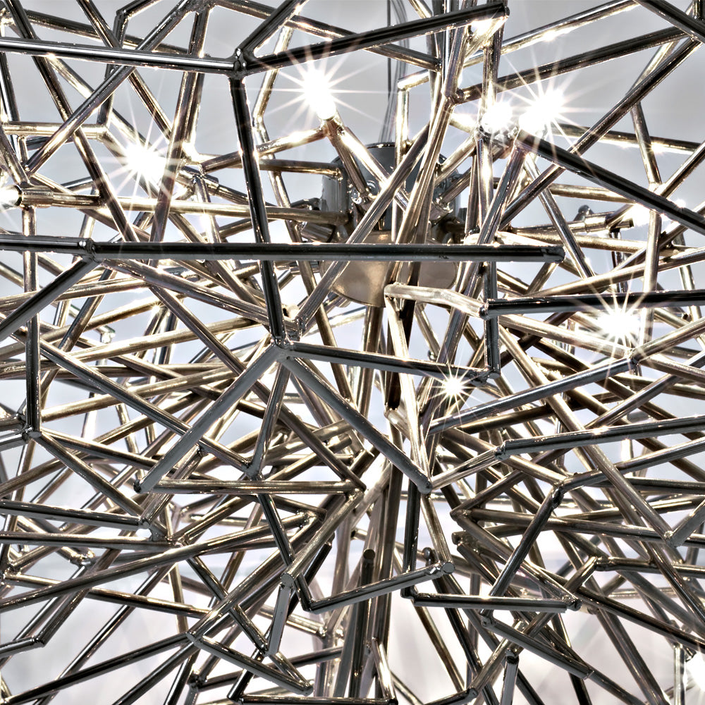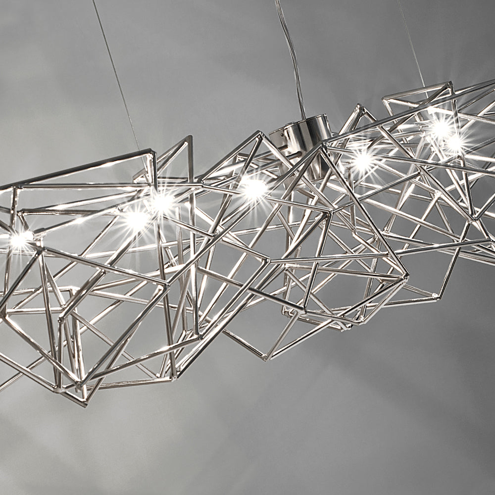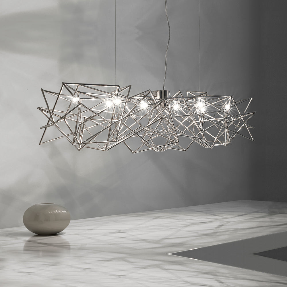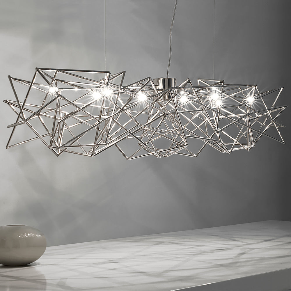 Modern Geometric Silver Pendant Light. This ultra modern design takes luxury and design to the next level. Inspired by the constellations, interwoven nickel plated metal shapescombine withstrategicallyplaced lights. This celestial design shinesin all directions creating gentle light and shadow.Use thisunorthodox design overa modern rectangular tablefor a strong contemporary statement. Height 20 cm x width 130 cm x depth 20 cm. Overall height is 200 cm.