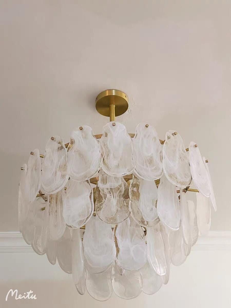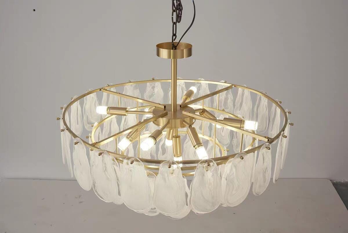 Create an elegant atmosphere in your home with this Round Cloud Glass Chandelier, The high-quality brass frame is finished in gold, complemented by multiple semi-transparent geometrically shaped glass layers. Soft light is diffused through the glass lampshade from multiple small bulbs for a warm, inviting ambience.