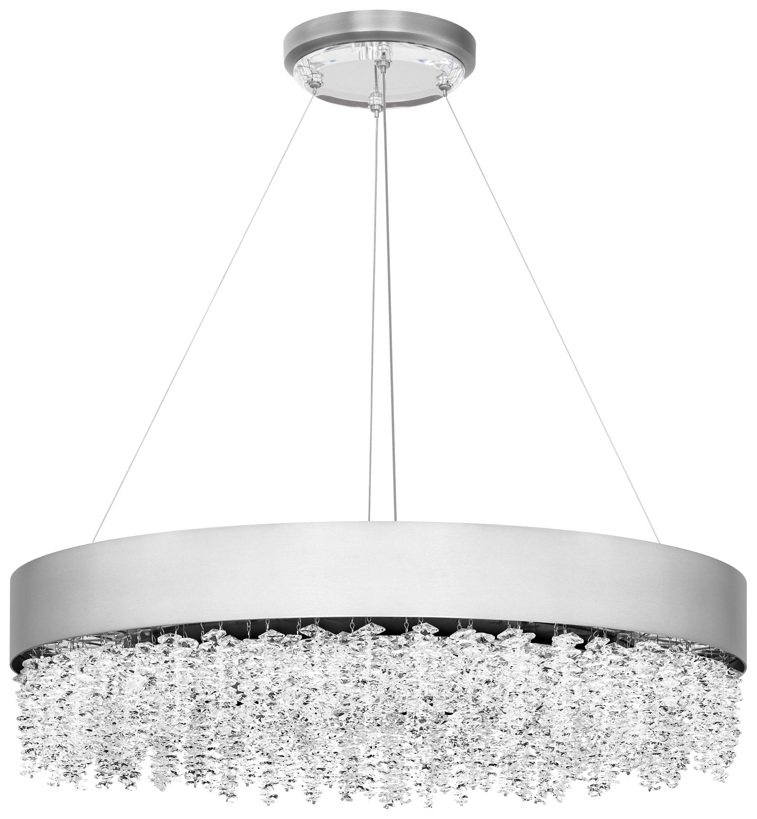• With strands of clear optic crystal strands. Polished nickel finish canopy and round frame. Metal construction.