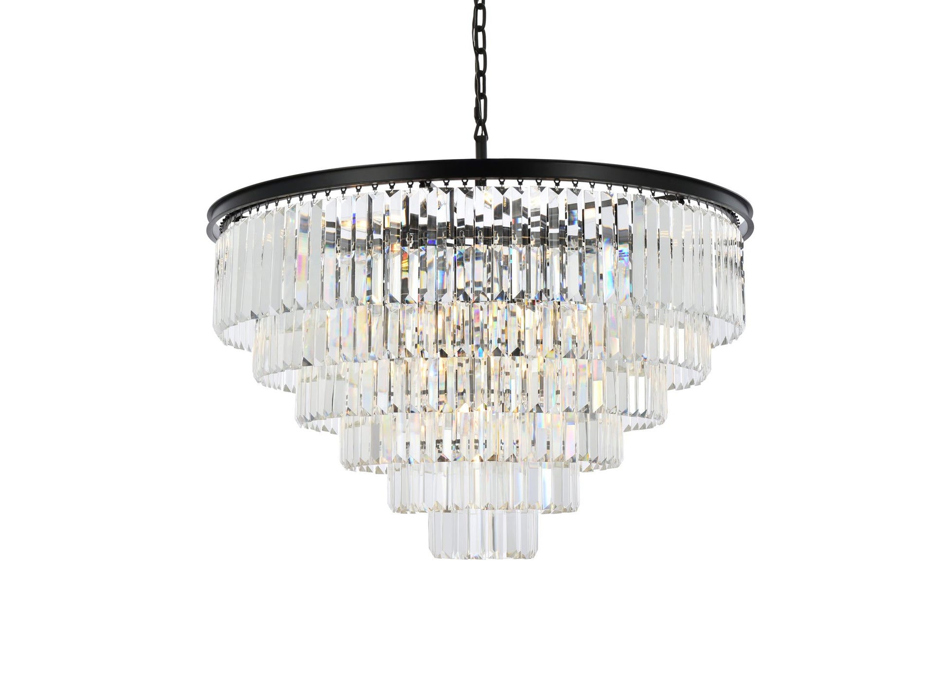 • Matte black finish over steel frame. Clear crystal tiered shade.