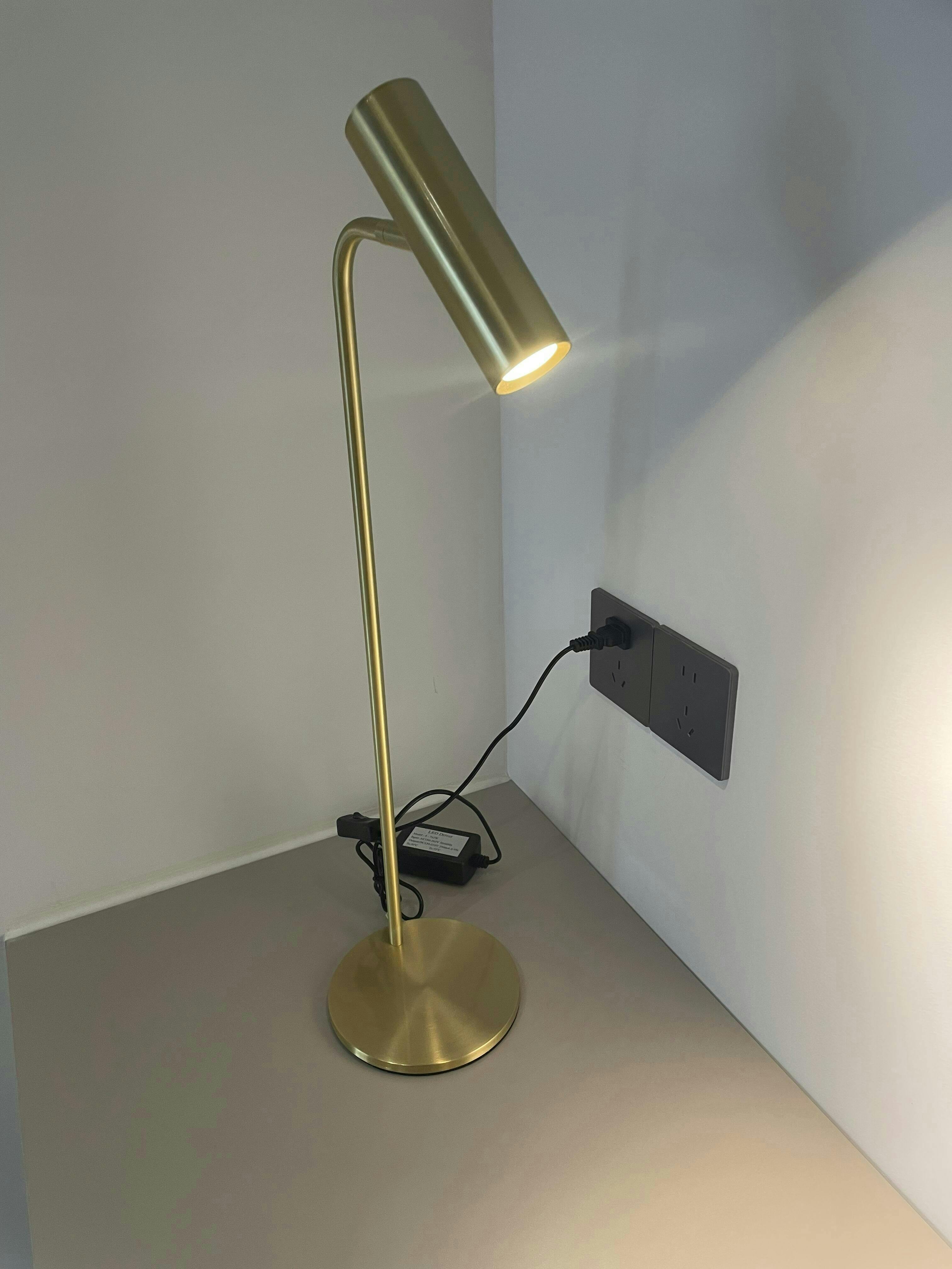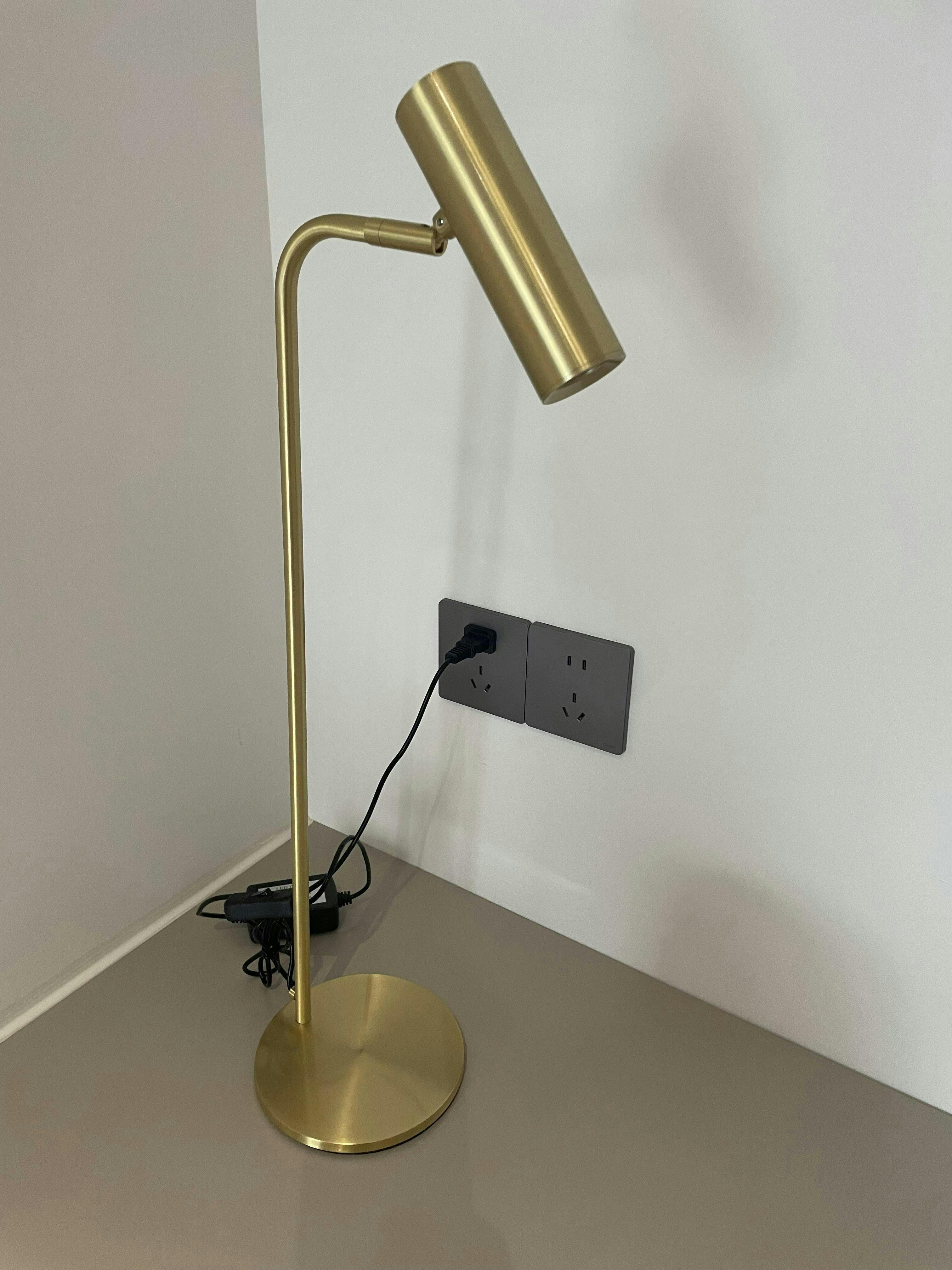 Torris Table Lamp offers a touch of subtle luxury, with a minimal design that embodies quality materials and craftsmanship. It features a slim Satin Brass body that curves to hold the adjustable cylindrical head that can be tilted to direct the light as needed, with a round Satin Brass finished table base.