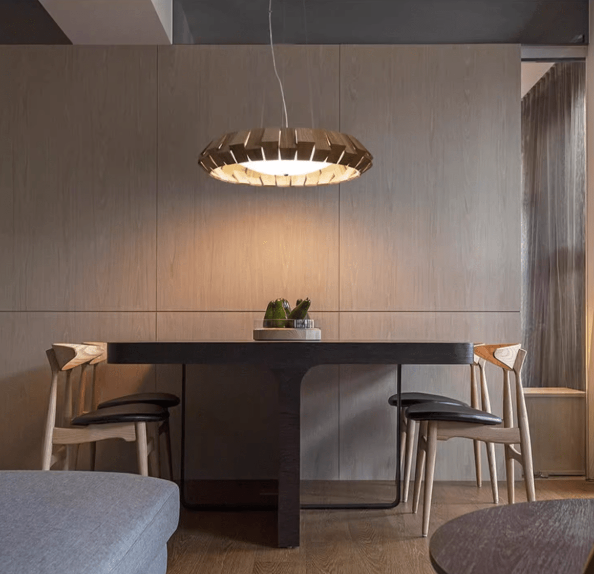 This chandelier features a ring structure crafted from multiple solid wood patches, with upper and lower wooden blocks arranged in a staggered manner to create a unique sense of layering. It has a wooden circular ceiling plate, suspended by metal wires. When lit, light filters through the gaps between the wooden blocks, creating a warm and natural ambiance. It combines the craftsmanship of hand - splicing with the rustic charm of wood, suitable for living rooms, dining rooms and other spaces, adding a natural and design - rich style to the home.