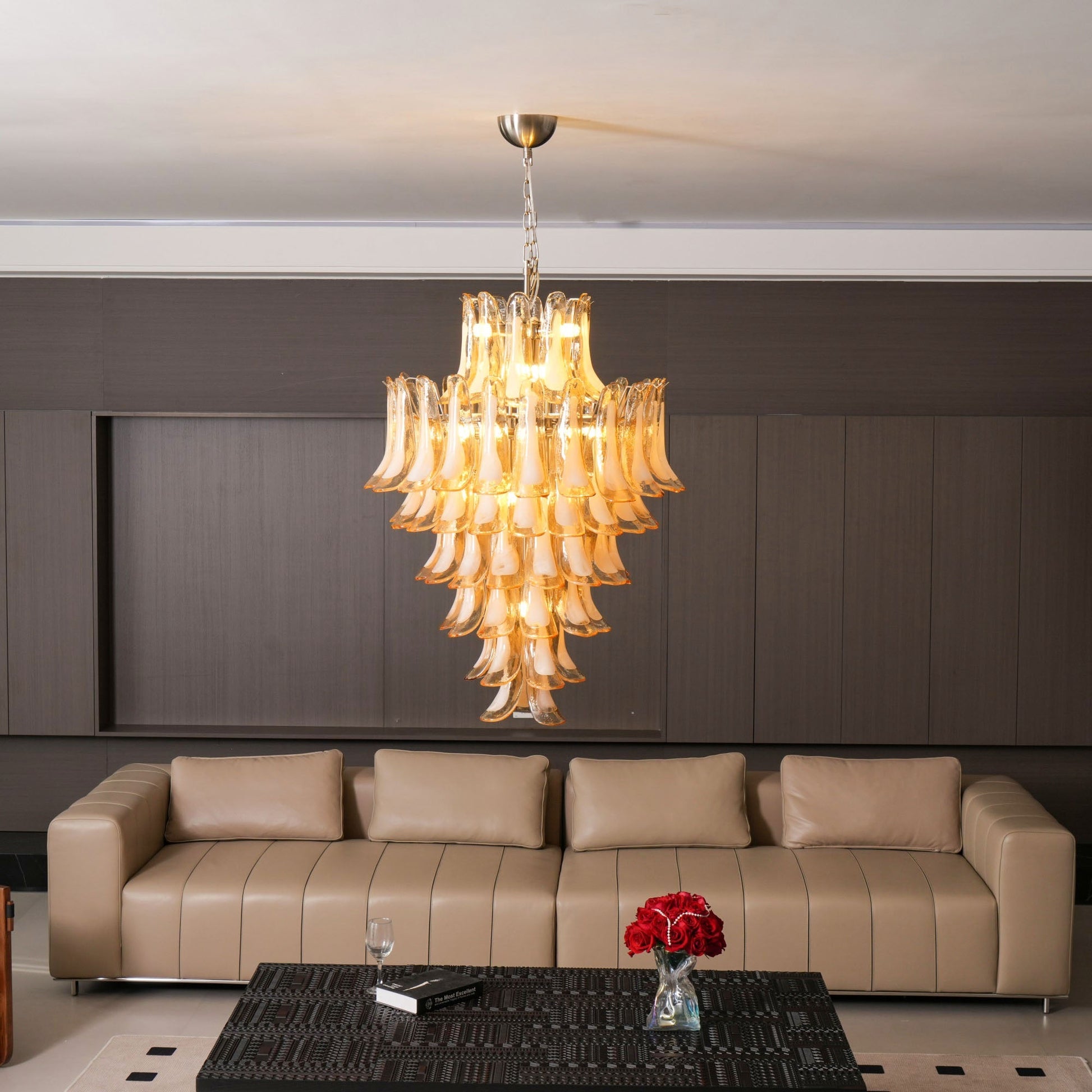 Enrich your surroundings with our Amber Murano Glass Petals Chandelier. Drawing inspiration from blossoming lotus petals, every component is skillfully crafted by hand in the Venetian style, emanating a cozy and opulent radiance. Ideal for sophisticated interiors, upscale dining, and exclusive hotels. Infuse any ambiance with timeless refinement.