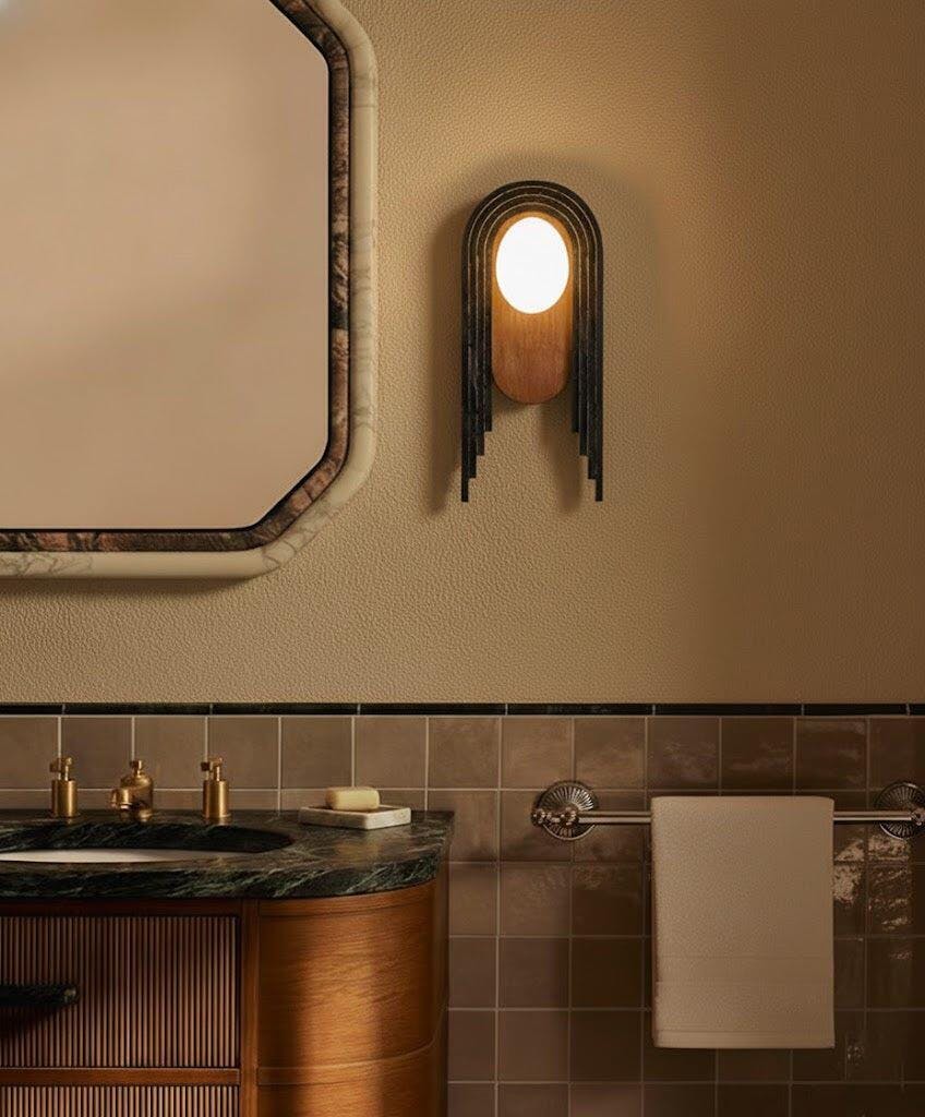 This striking wall sconce is a sculptural piece that elevates any interior with its bold, geometric form and captivating material contrast. The fixture features a layered, stepped arch design crafted from wood with a dramatic distressed black finish, evoking a modern Art Deco or Maximalist aesthetic. At its core, an elegant oval cutout reveals a contrasting, warm natural wood panel that serves as a reflector for the hidden light source. The resulting illumination is a sophisticated backlit or diffused glow, highlighting the rich texture of the black frame and creating a perfect blend of dramatic flair and natural warmth for entryways, hallways, or feature walls.
