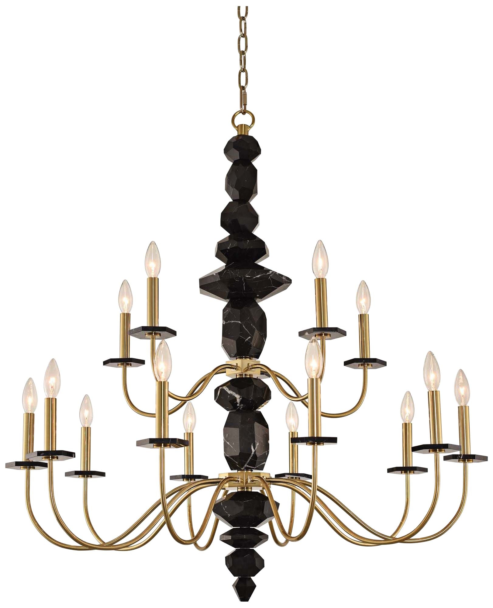 A two-tier design and black glass accents create sophisticated flair for this 15-light brass chandelier.
