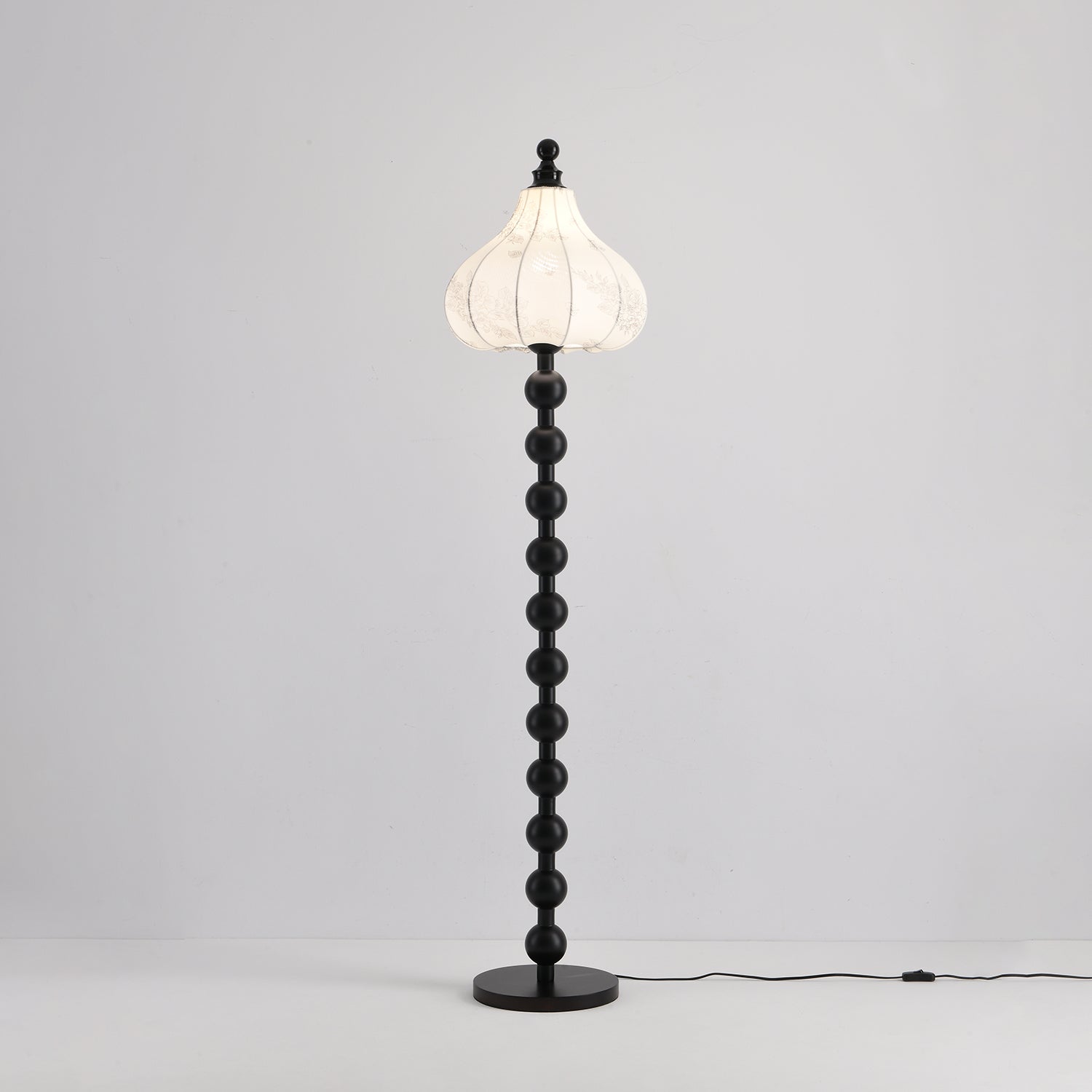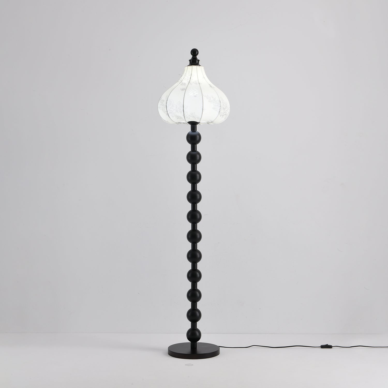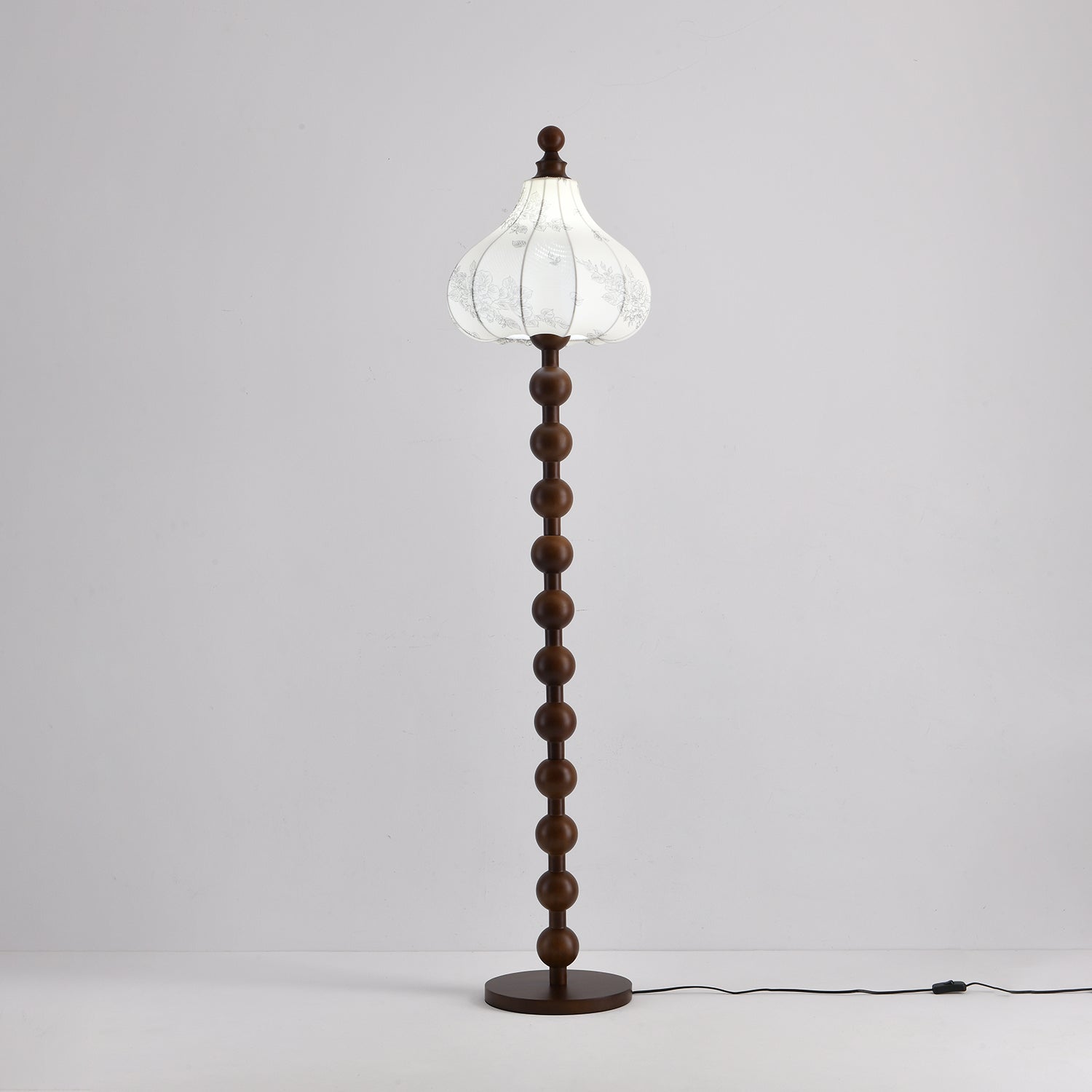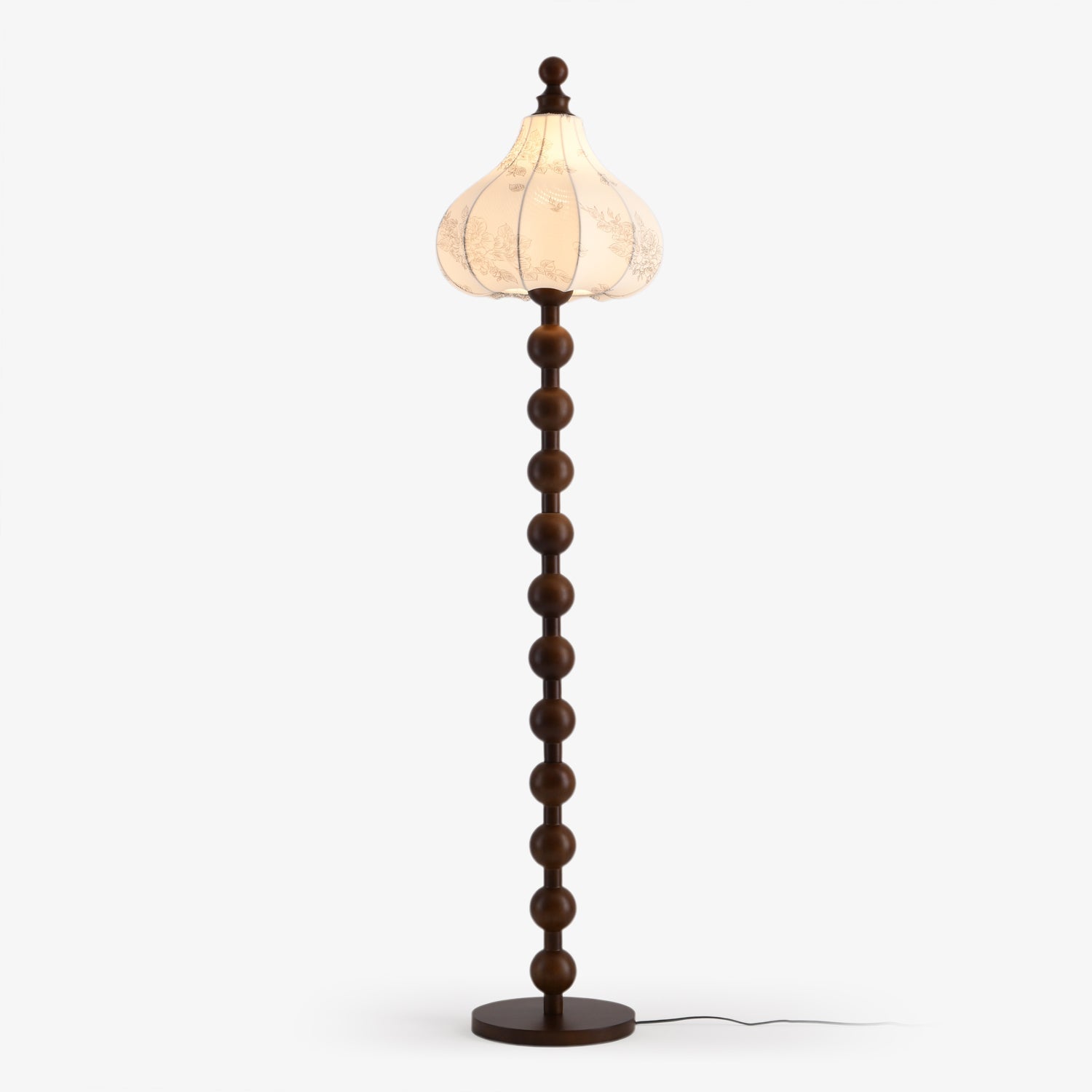 The Astrid Fabric Floor Lamp is a unique and captivating piece, featuring a distinctive white carved fabric lampshade that evokes the shape of a full pumpkin or onion dome, exuding a rich and exotic charm. Its tall, stable pole is artfully constructed from a series of dark-toned, round solid wood beads, culminating in a perfectly matching round base. This lamp's design seamlessly blends vintage elegance with bohemian flair, promising to infuse any living space with a warm, romantic, and artistic ambiance.
