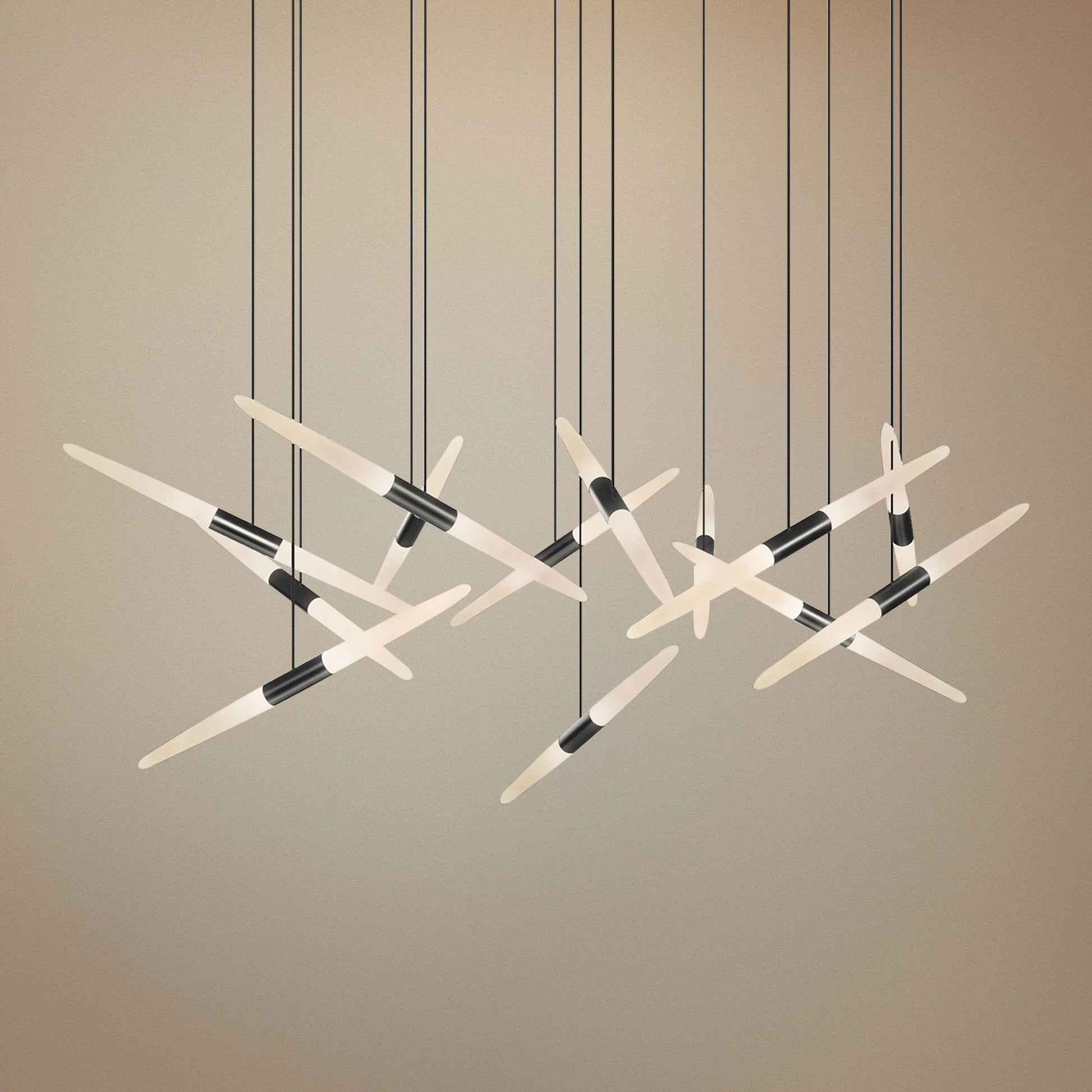 The contemporary Ballet LED pendant light by Sonneman in satin black features an assortment of thirteen frosted glass rod accents.