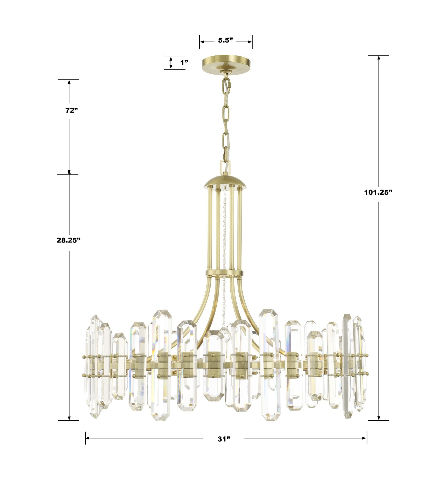 Elevate your home with this glamorous twelve-light crystal chandelier in aged brass finish, perfect to illuminate your living space.