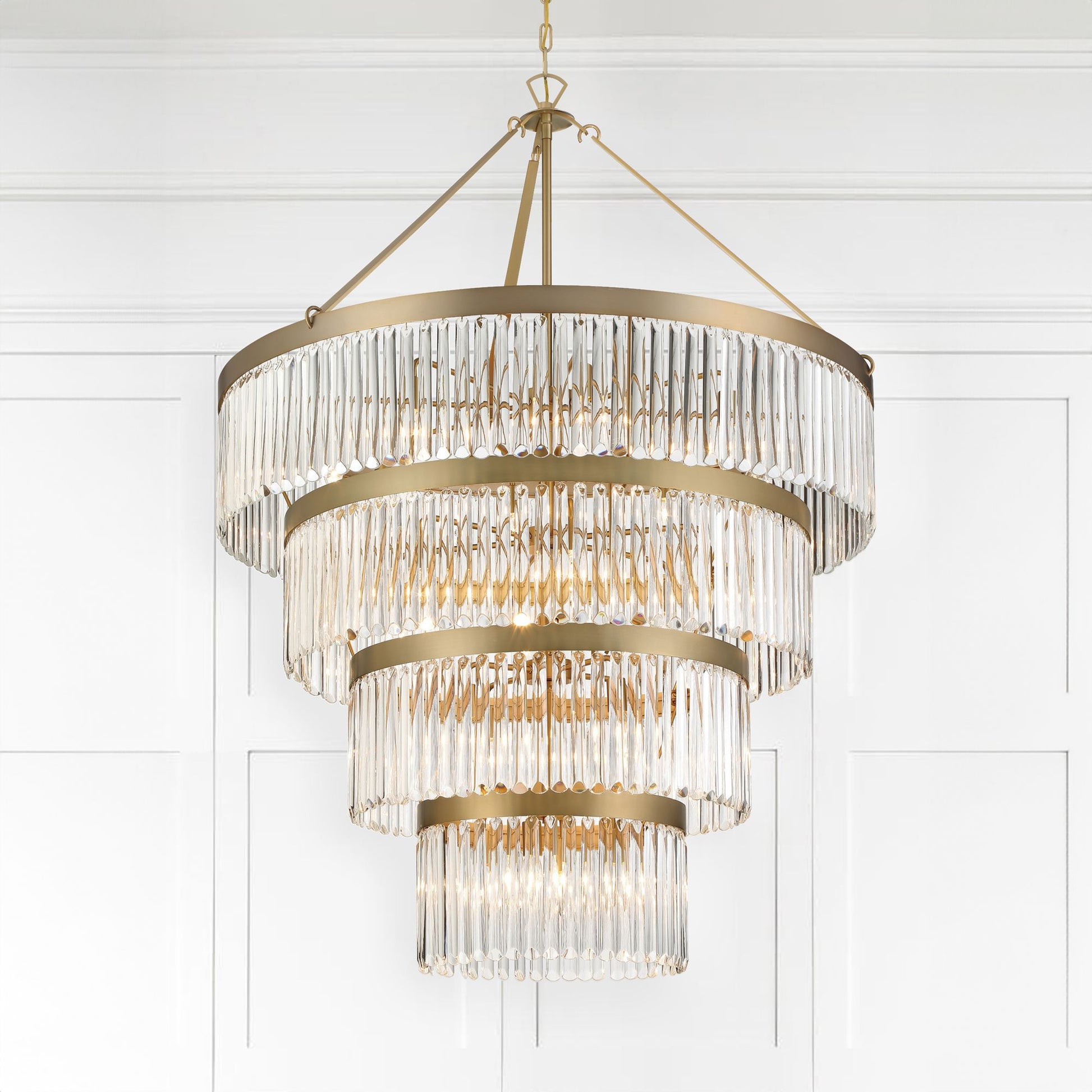 An impactful chandelier with modern gold finish over a steel frame and cascading multi-tiered faceted crystal glass prisms.