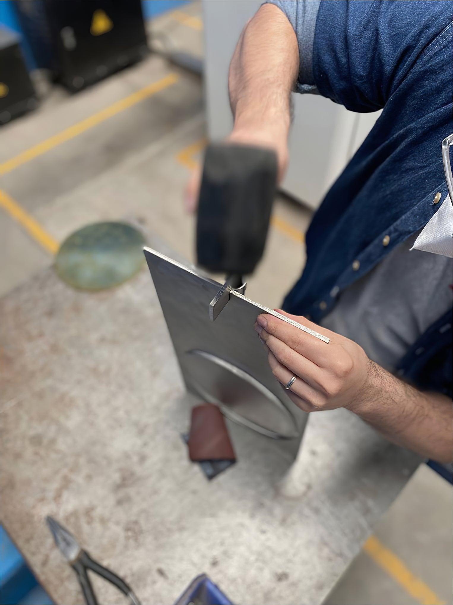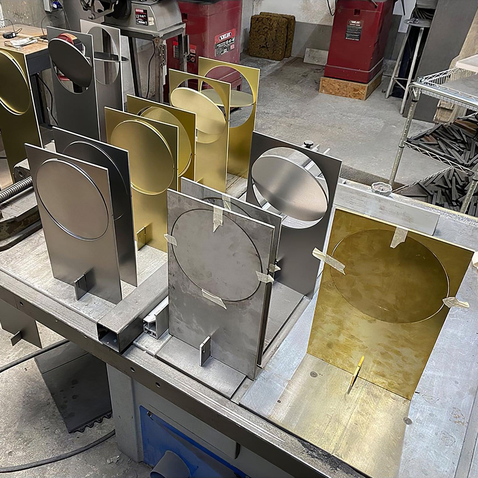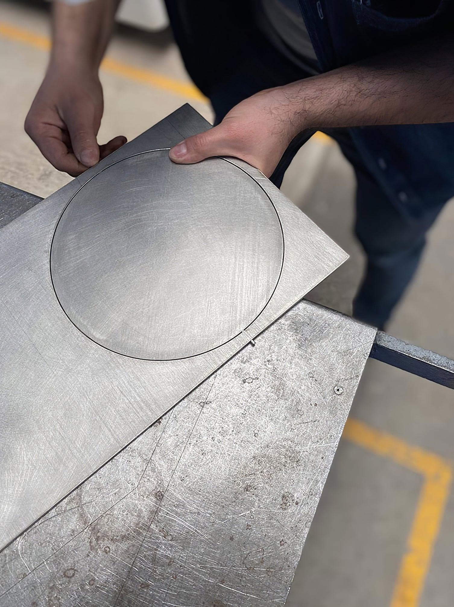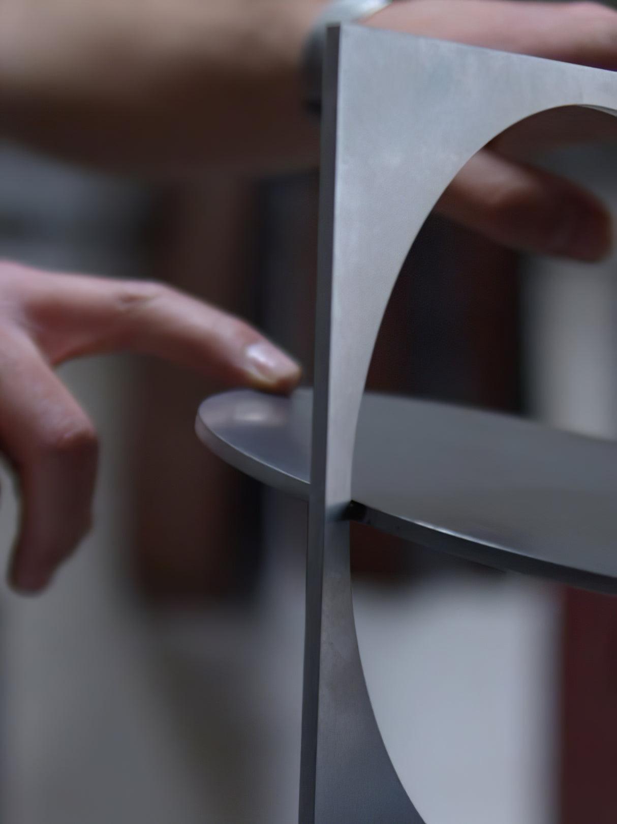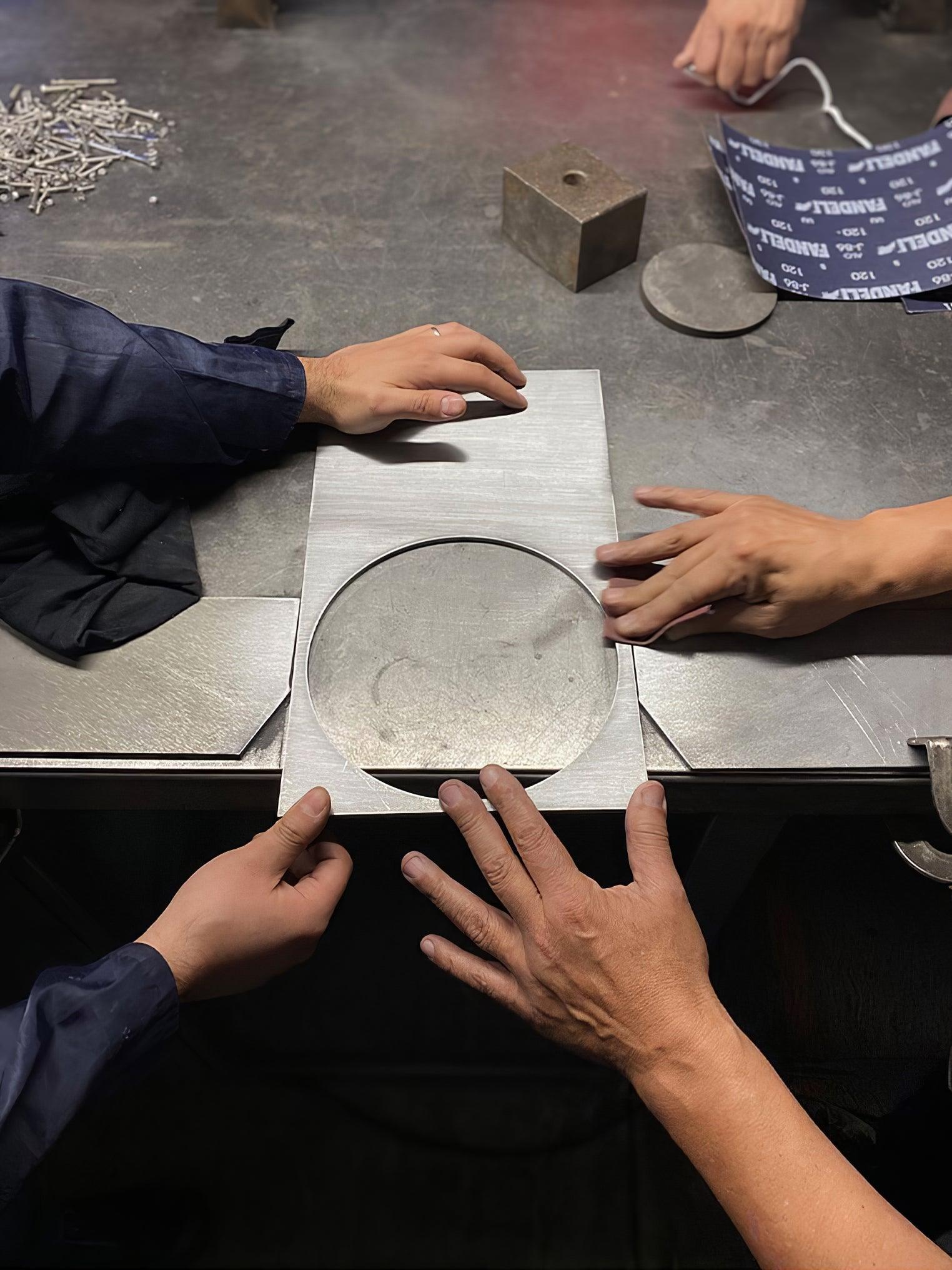 OBJ-01 is an understandable simple gesture, an object that needs no explanation. At a glance, it reveals its material, its manufacturing process, its function and its use. A plate of raw metal, cut by laser and assembled by hand with a rubber hammer and no welding joinery. Its size responds to the modulation and format of the material in its commercial standards. Pure geometric figures build the lighting fixture; a rectangle, a circle and a cylinder at the back which contains the LED light spot. The circle, when cut out, adopts the function of a screen and can rotate 360 degrees to direct the light at will.