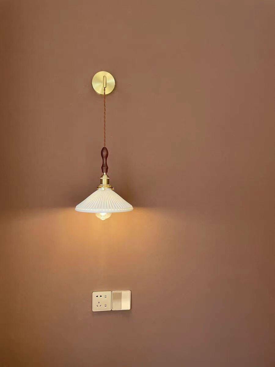 Our Pleated Wooden Wall Lamp is a stylish and functional design featuring a stunning cone-shaped pleated fabric lampshade, crafted from beautiful walnut wood and brass. It's minimalist design and warm light provide a perfect accent to any room.