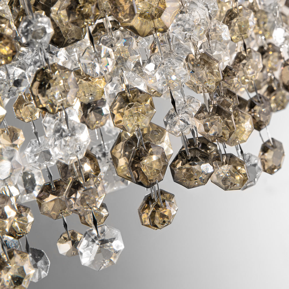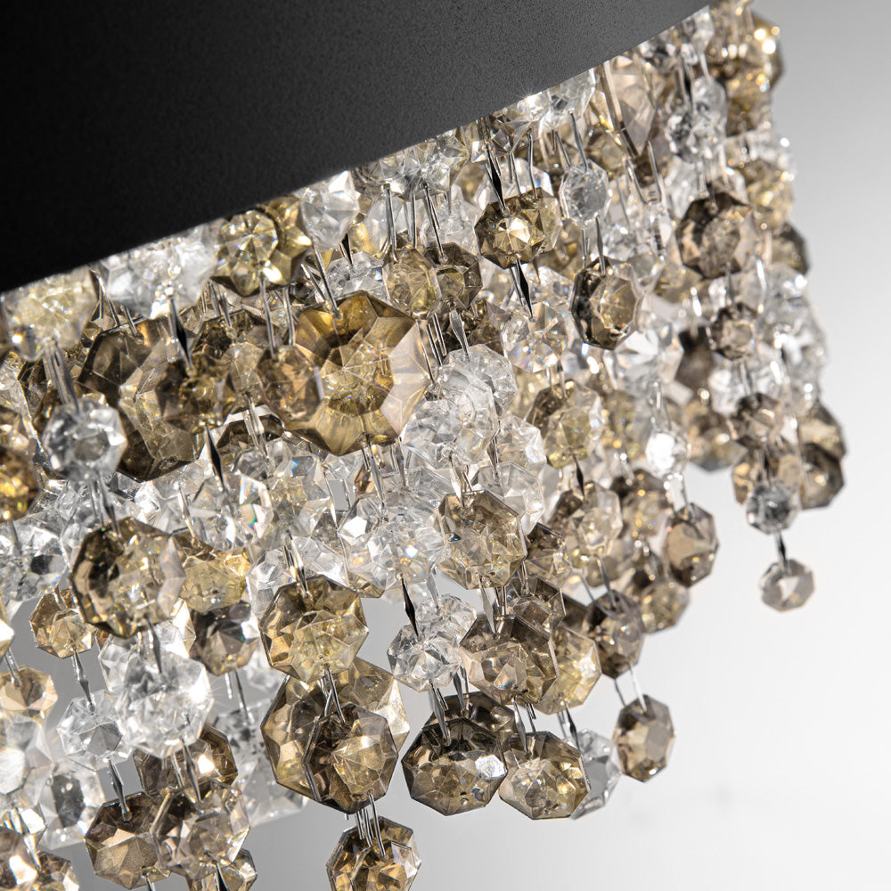 The Round Matt Black Chandelier Ceiling Light, embracing modern design elements with classic chandelier style. This LED ceiling light combines a round metal frame beautifully finished in a contemporary matt black. Together with a profusion of China smoky toned half cut glass pendants, altogether creating a stylish modern light. Frame finishes also include matt bronze and matt white together with silver, copper and gold leaf. Also offers a selection of beautiful complementary coloured cut glass pendants in which to tailor your interior colour scheme.