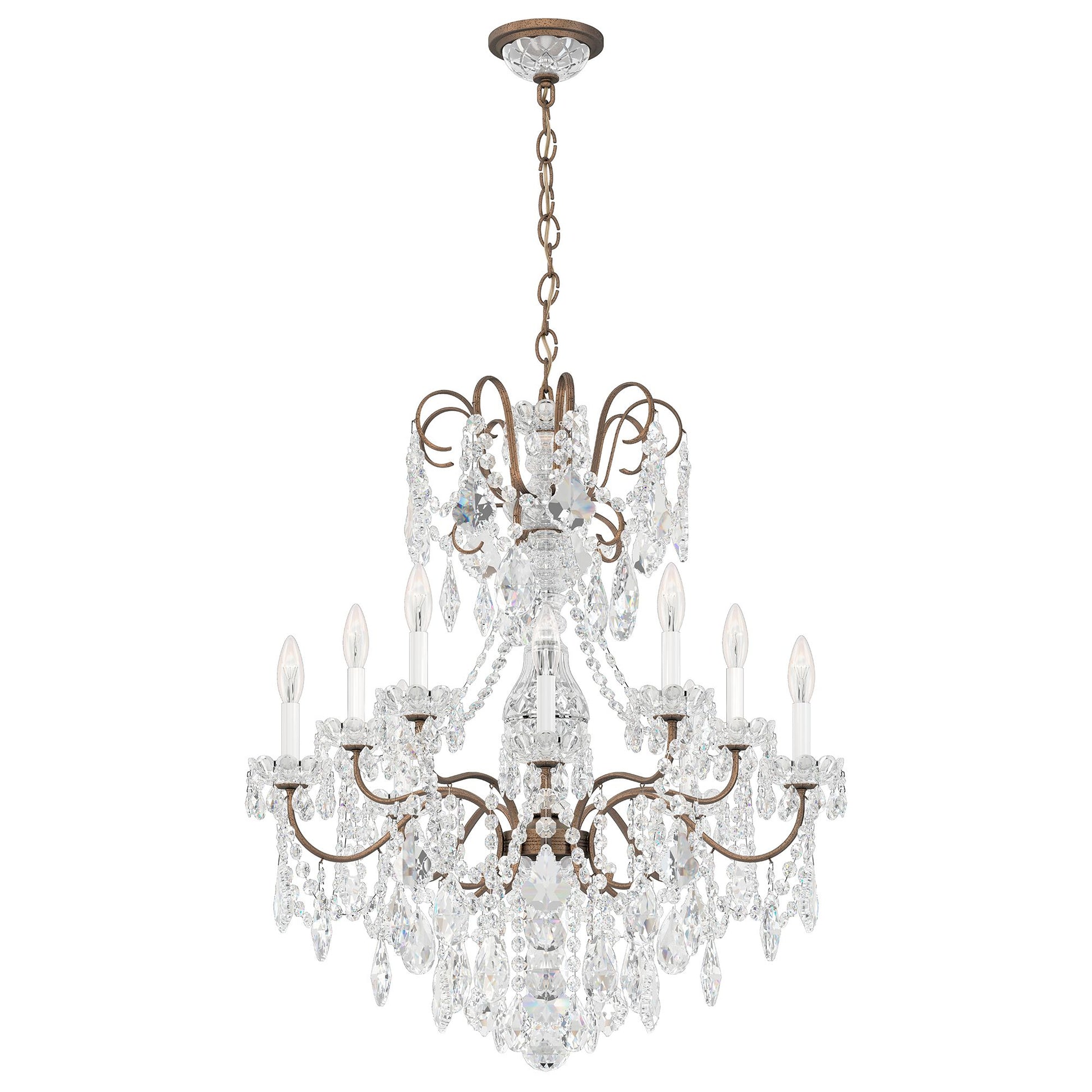 Graceful and delicate scrolls peek from within the cascade of beautiful crystal in this grand chandelier design.