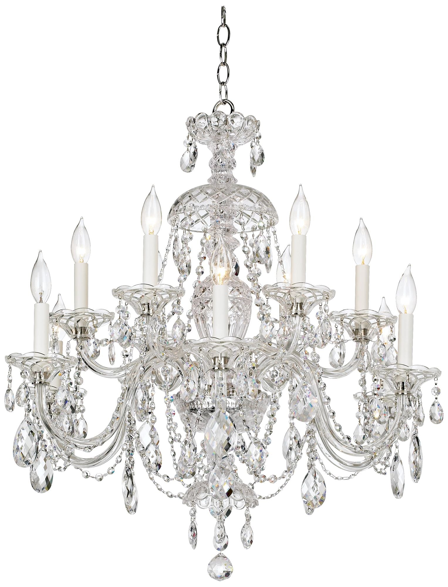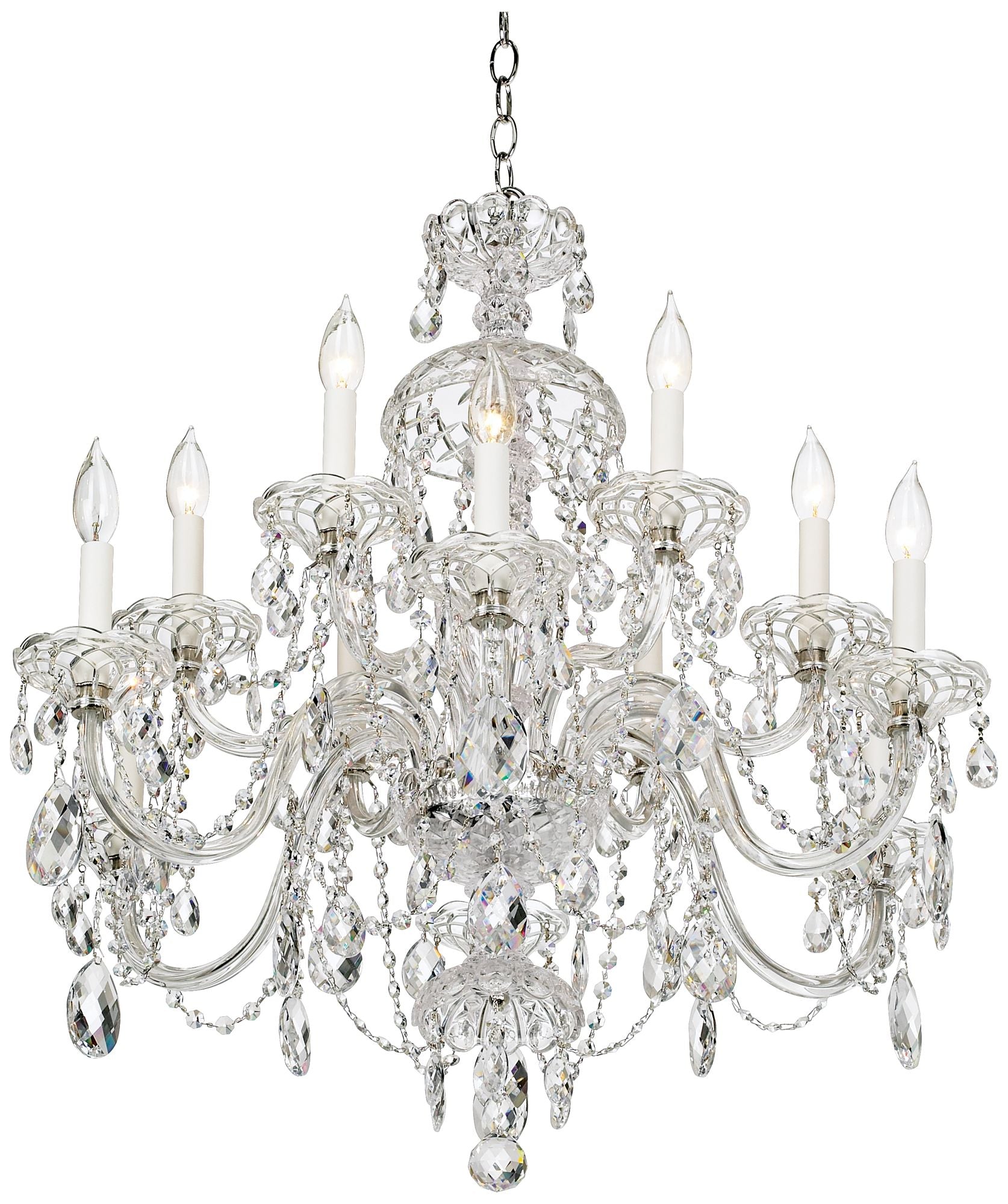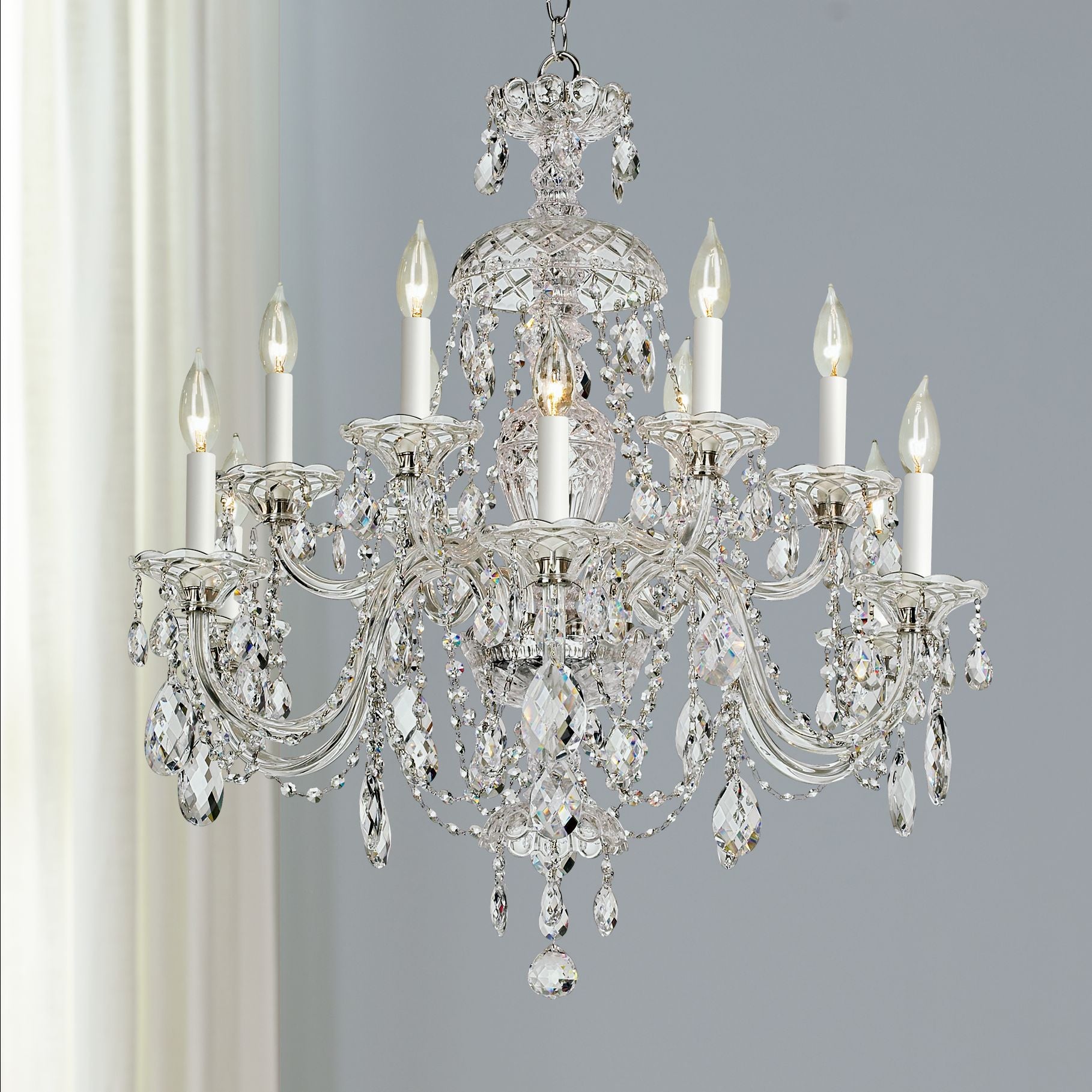 • A traditional design by Schonbek crystal chandeliers. Two tiers of candelabra style lights.