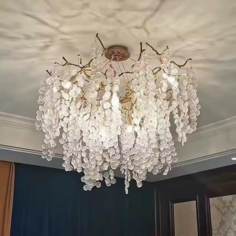 Like dewdrops under a forest canopy, the Shiro Noda Chandelier collection displays glistening glass coins that cascade from organic leaves and branches. A modern nod to nature, this collection is a natural in contemporary settings. This chandelier is large enough to hang in a great room, foyer, or dining and living rooms with high ceilings.