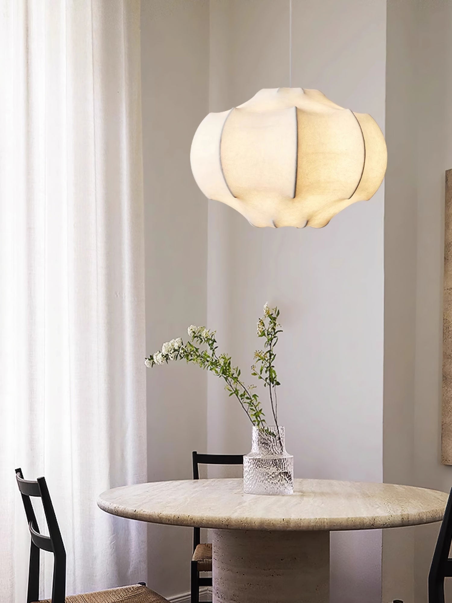The Silken Lotus Pendant Lamp embodies elegance with its lantern-like silhouette crafted from fine silk. The natural texture of the silk softly diffuses the light, creating a warm and serene atmosphere that feels both refined and inviting. Its sculptural form, reminiscent of a lotus in bloom, brings a touch of organic beauty and timeless charm. With an adjustable 150 cm suspension, this pendant adapts perfectly to dining rooms, bedrooms, or living spaces, infusing interiors with a delicate glow and sophisticated character.