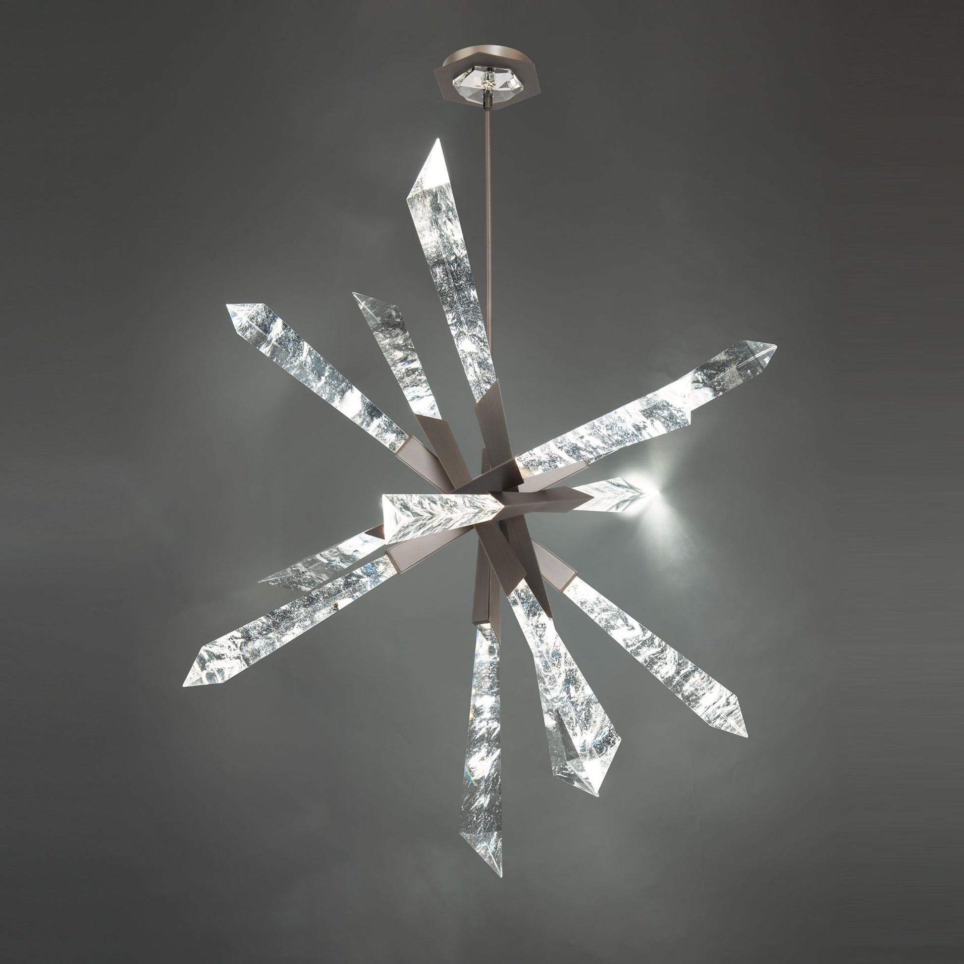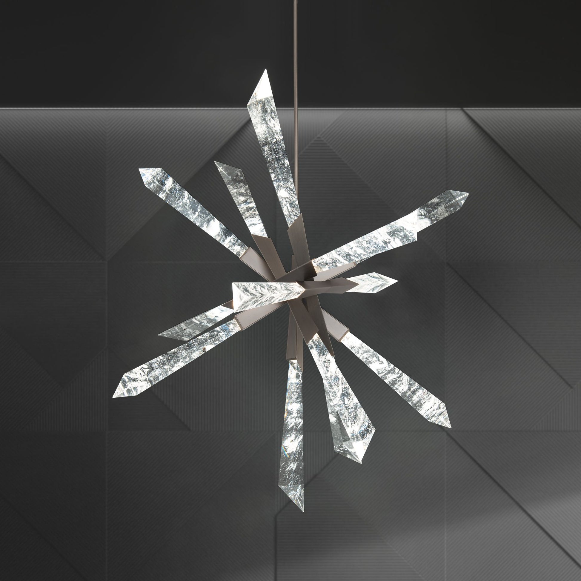 An icy starburst motif is achieved with optic haze crystal that sparkles in this contemporary LED pendant light.