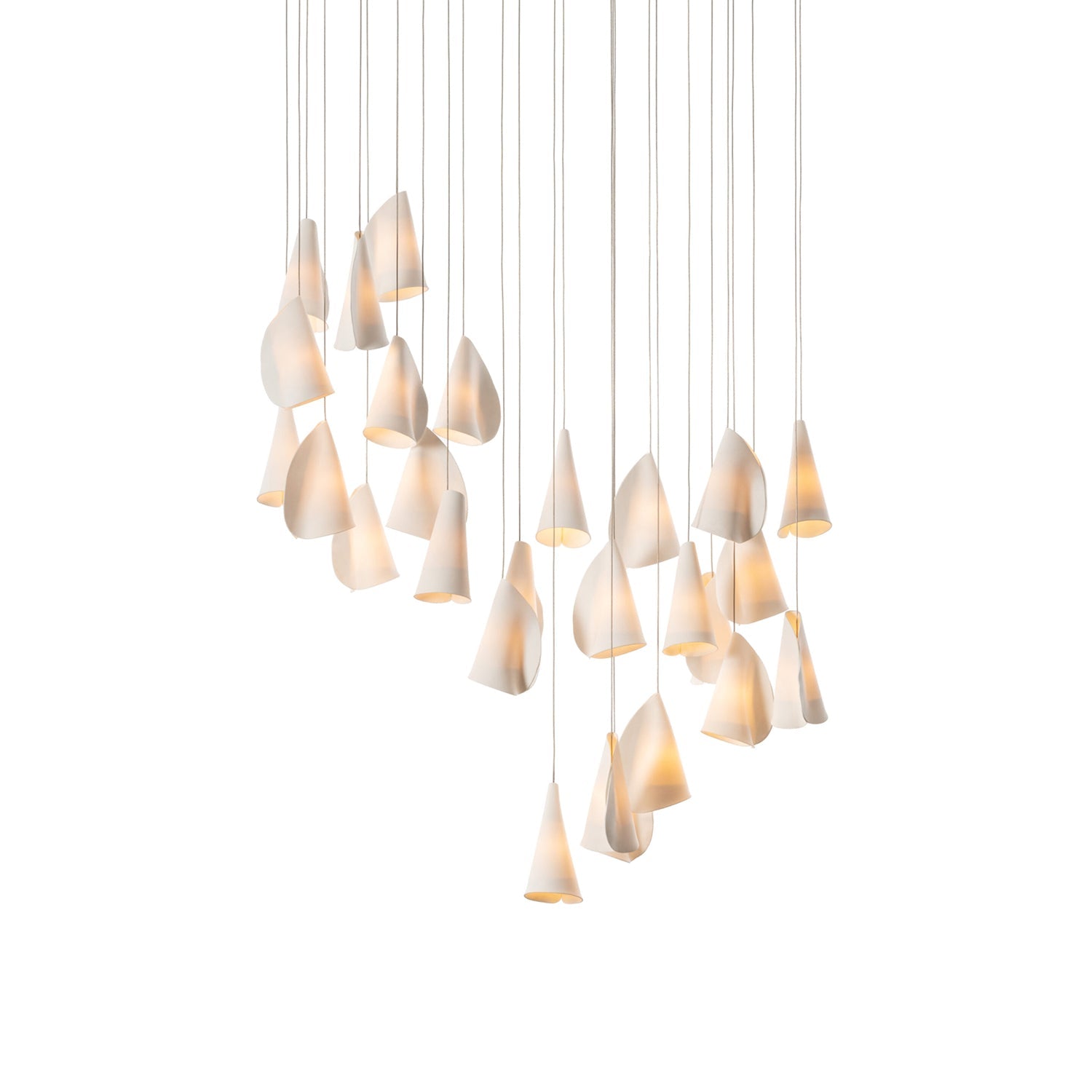Inspired by the soft descent of wind chimes, the Sonora Ceramics Chandelier features a cascade of handcrafted porcelain shades—each with its own subtle variation, like petals suspended mid-air. The organic silhouette creates a quiet drama, merging artistry and illumination in perfect balance.