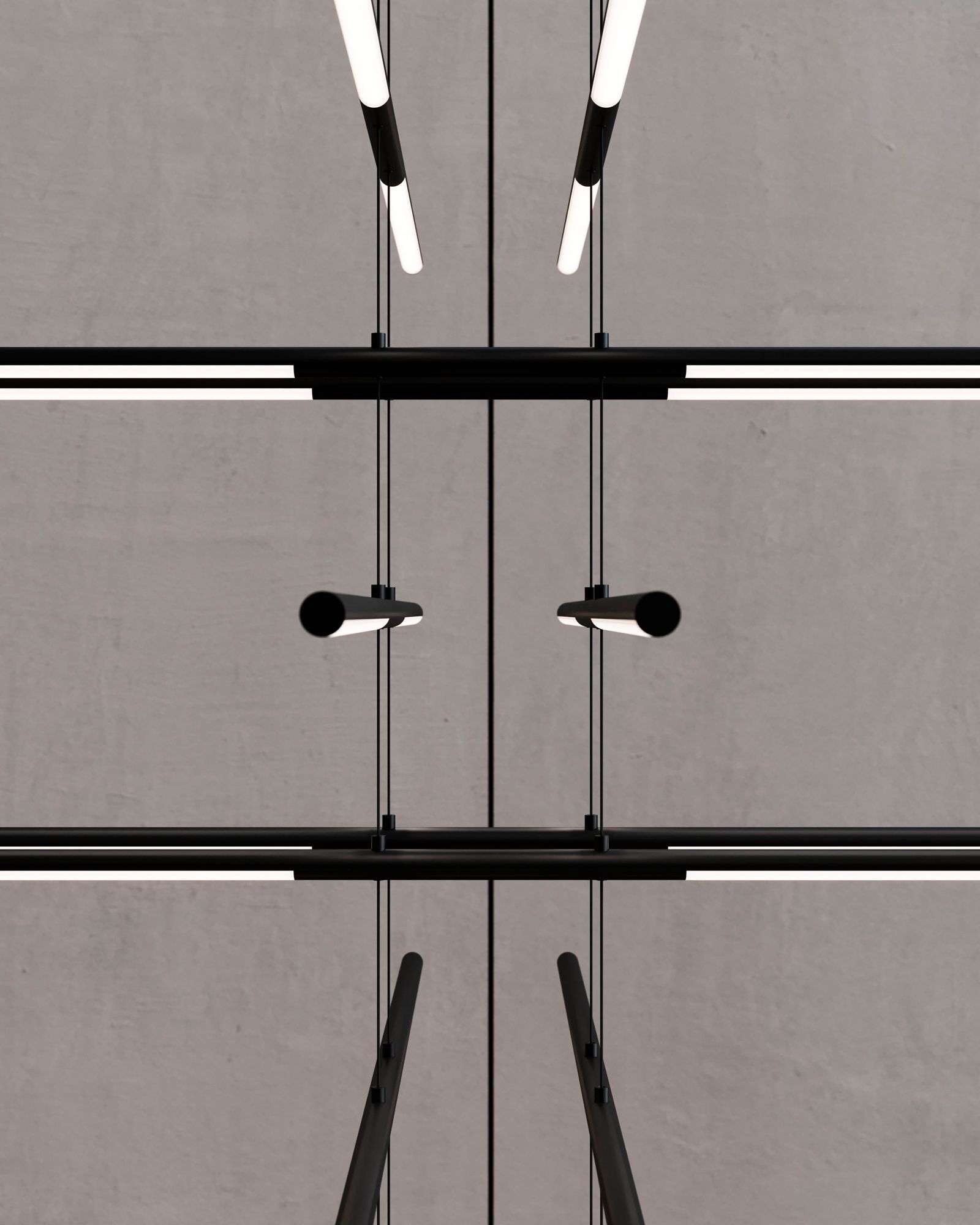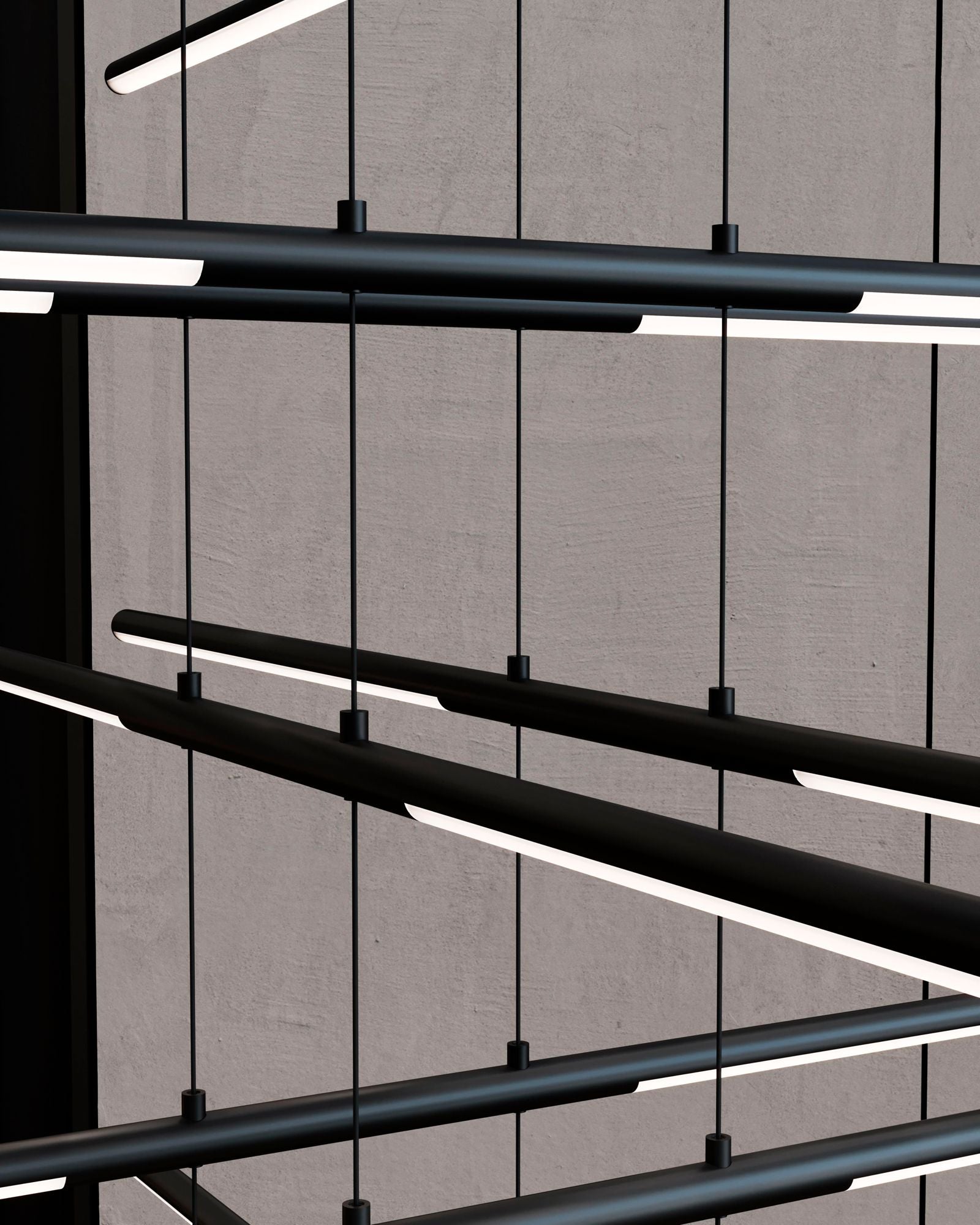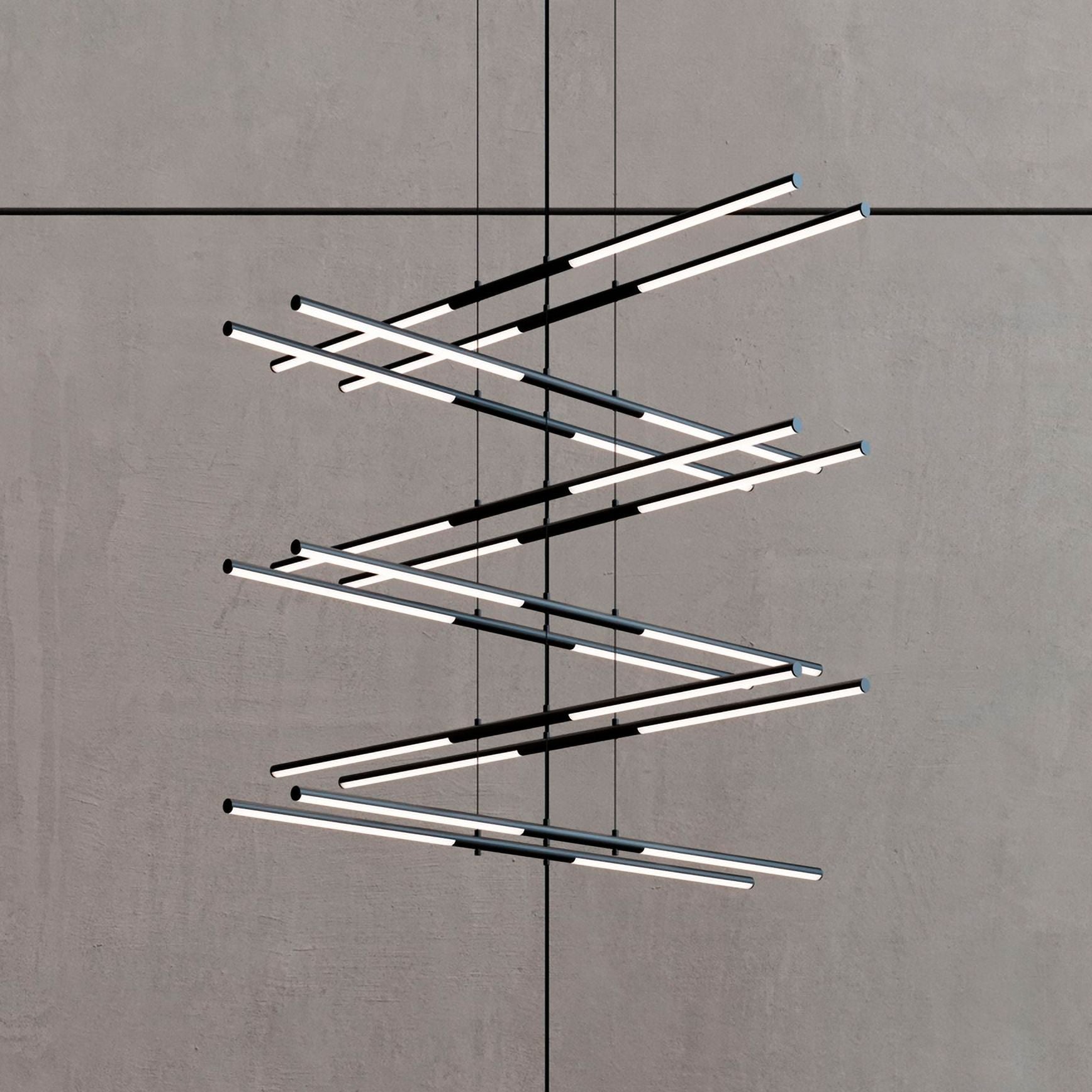 With its dynamic silhouette, the Tik-Tak stack six-tier LED pendant light by Sonneman has a satin black finish along its linear design.