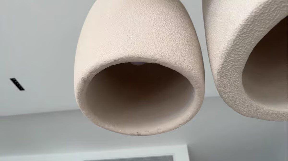 The designer’s collection of lighted works is hand-made in Chinese factory High-density polystyrene. The opaqueness of the High-density polystyrene is to create which allows for a warm luminosity.