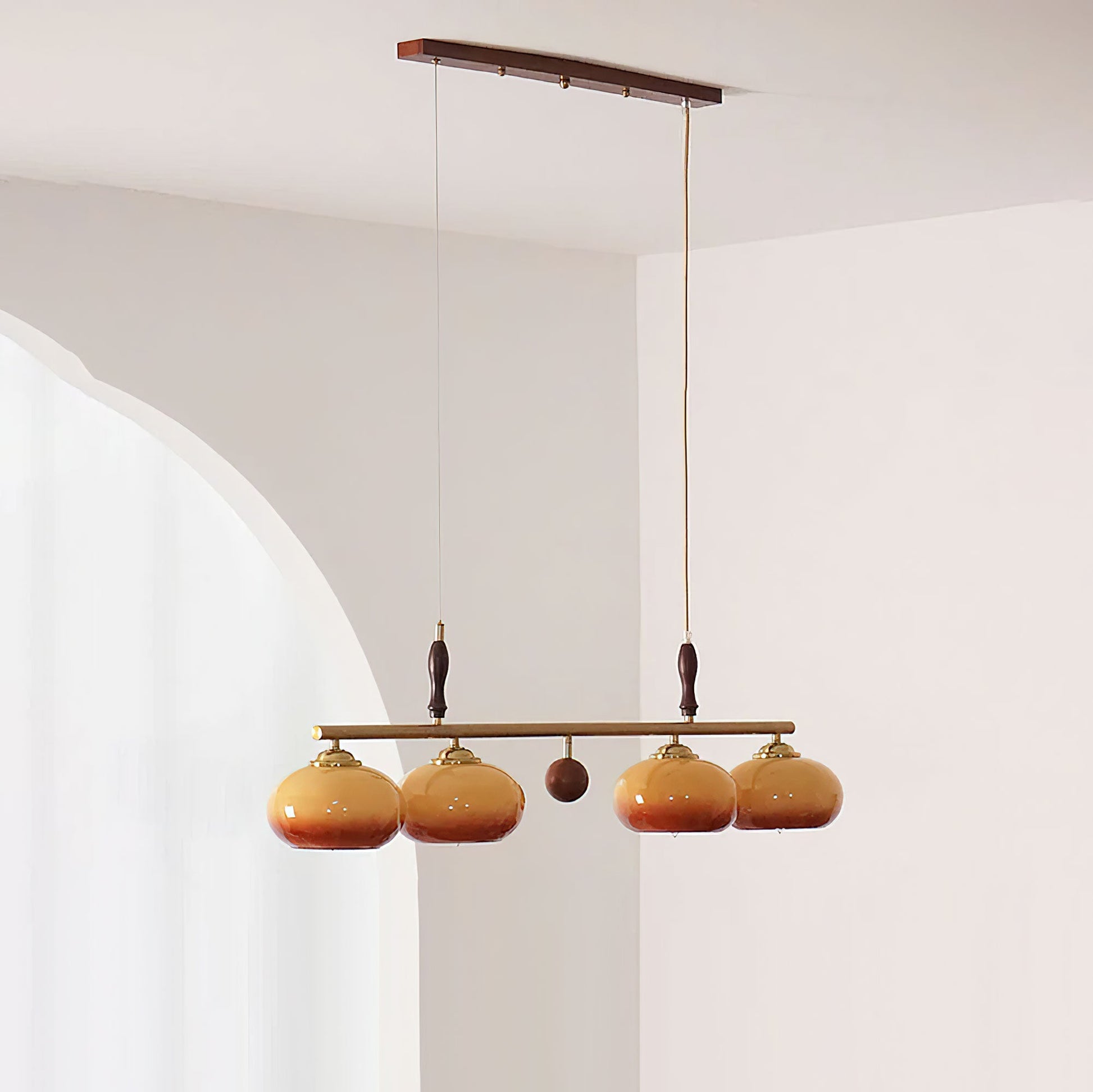The Amber Trio Pendant Lamp brings a warm and inviting atmosphere with its three luminous glass shades in a rich honey hue. Balanced on a sleek brass bar and accented with wooden details, it merges vintage charm with modern elegance. The soft glow of the amber glass makes it perfect for dining tables, kitchen islands, or cozy living areas, creating both functional illumination and a stylish centerpiece.