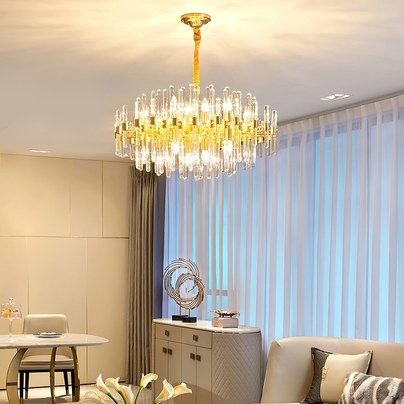 The Antique Brass Chandelier boasts a starburst design that's contemporary and stylish. Made of brass with a vintage-inspired brushed brass finish, and getting its cue from mid-century modern designs, this incredible chandelier is highlighted with clear glass rods that give it a sparkling, spacy effect. perfectly marries the modern elegance of the past with the flair of anew. Finished in a beautifully refined Burnished Antique Brass finish accented by clear glass rods, destined to withstand the ages. Made with solid brass construction to look great.