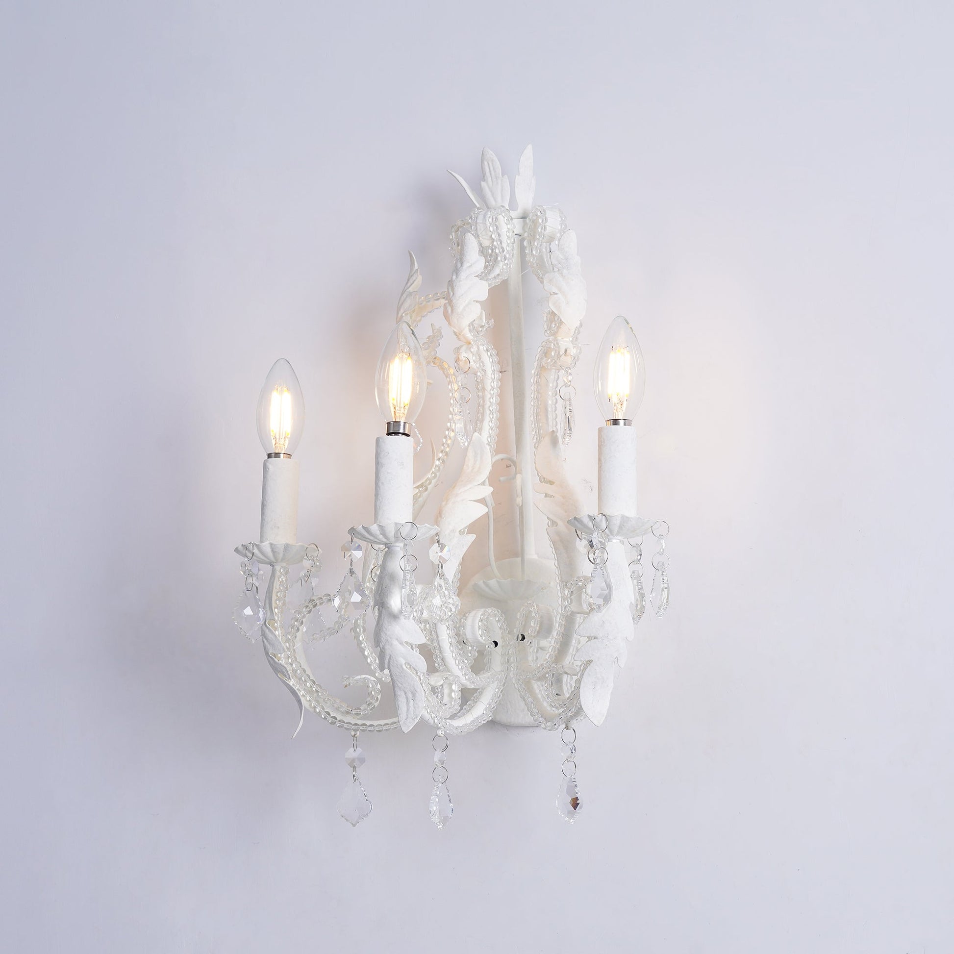 With a mix of scrolling arms, glittering crystal beads and delicate botanical accents, our wall lamp exhibits equal amounts of genteel sweetness and unabashed grandeur.